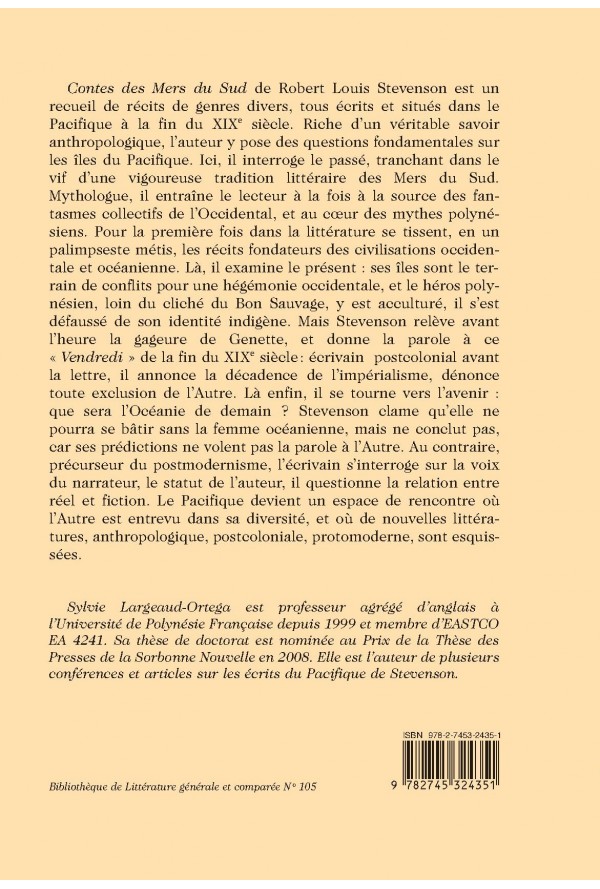 Contes des Mers du Sud de Robert Louis Stevenson est un recueil de récits de genres divers, tous écrits et situés dans le Pacifique à la fin du XIXe siècle. Riche d’un véritable savoir anthropologique, l’auteur y pose des questions fondamentales sur les îles du Pacifique. Ici, il interroge le passé, tranchant dans le vif d’une vigoureuse tradition littéraire des Mers du Sud. Mythologue, il entraîne le lecteur à la fois à la source des fantasmes collectifs de l’Occidental, et au cœur des mythes polynésiens. Pour la première fois dans la littérature se tissent, en un palimpseste métis, les récits fondateurs des civilisations occidentale et océanienne. Là, il examine le présent : ses îles sont le terrain de conflits pour une hégémonie occidentale, et le héros polynésien, loin du cliché du Bon Sauvage, y est acculturé, il s’est défaussé de son identité indigène. Mais Stevenson relève avant l’heure la gageure de Genette, et donne la parole à ce « Vendredi » de la fin du XIXe siècle : écrivain postcolonial avant la lettre, il annonce la décadence de l’impérialisme, dénonce toute exclusion de l’Autre. Là enfin, il se tourne vers l’avenir : que sera l’Océanie de demain ? Stevenson clame qu’elle ne pourra se bâtir sans la femme océanienne, mais ne conclut pas, car ses prédictions ne volent pas la parole à l’Autre. Au contraire, précurseur du postmodernisme, l’écrivain s’interroge sur la voix du narrateur, le statut de l’auteur, il questionne la relation entre réel et fiction. Le Pacifique devient un espace de rencontre où l’Autre est entrevu dans sa diversité, et où de nouvelles littératures, anthropologique, postcoloniale, protomoderne, sont esquissées.
