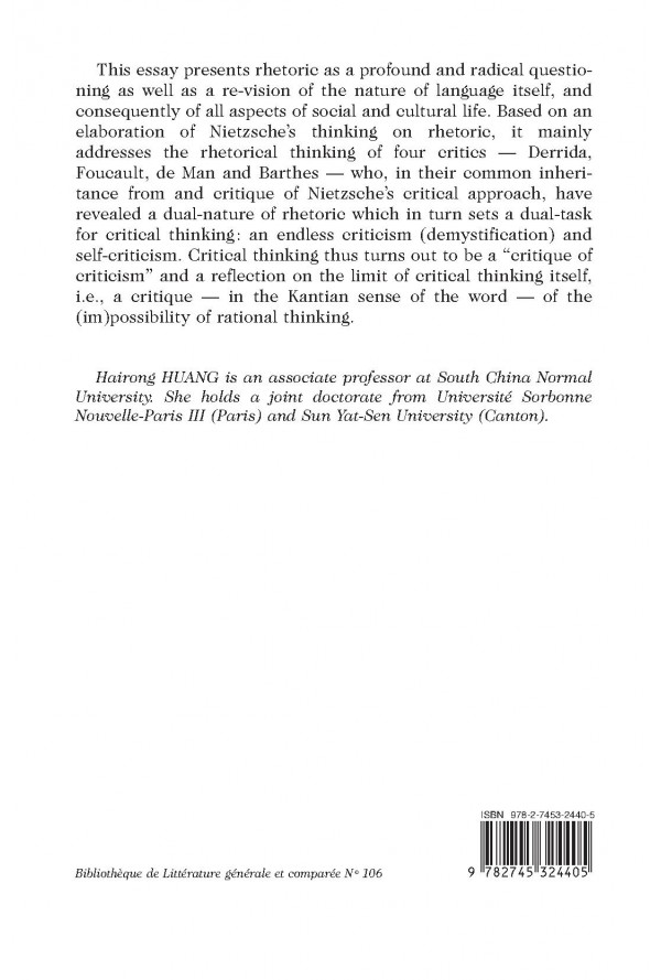 This assay presents rhetoric as a profound and radical questioning as well as a re-vision of the nature of language itself, and consequently of all aspects of social and cultural life. Based on an elaboration of Nietzsche’s thinking on rhetoric, it mainly addresses the rhetorical thinking of four critics — Derrida, Foucault, de Man and Barthes — who, in their common inheritance from and critique of Nietzsche’s critical approach, have revealed a dual-nature of rhetoric which in turn sets a dual-task for critical thinking: an endless criticism (demystification) and self-criticism. Critical thinking thus turns out to be a “critique of criticism” and a reflection on the limit of critical thinking itself, i.e., a critique — in the Kantian sense of the word — of the (im)possibility of rational thinking.