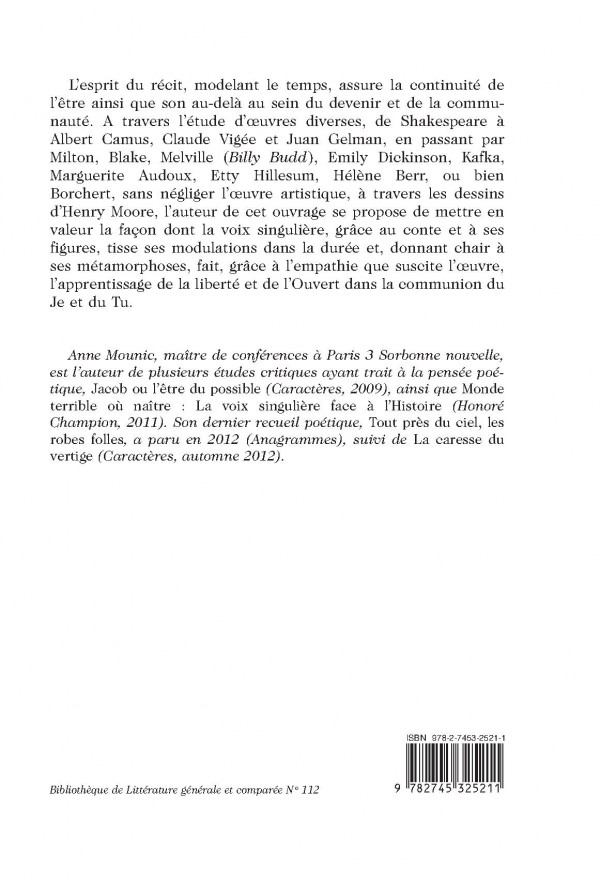 L’esprit du récit, modelant le temps, assure la continuité de l’être ainsi que son au-delà au sein du devenir et de la communauté. A travers l’étude d’œuvres diverses, de Shakespeare à Albert Camus, Claude Vigée et Juan Gelman, en passant par Milton, Blake, Melville (Billy Budd), Emily Dickinson, Kafka, Marguerite Audoux, Etty Hillesum, Hélène Berr, ou bien Borchert, sans négliger l’œuvre artistique, à travers les dessins d’Henry Moore, l’auteur de cet ouvrage se propose de mettre en valeur la façon dont la voix singulière, grâce au conte et à ses figures, tisse ses modulations dans la durée et, donnant chair à ses métamorphoses, fait, grâce à l’empathie que suscite l’œuvre, l’apprentissage de la liberté et de l’Ouvert dans la communion du Je et du Tu.