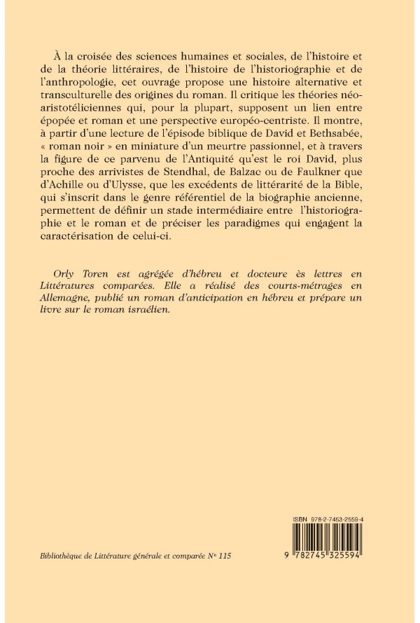 À la croisée des sciences humaines et sociales, de l’histoire et de la théorie littéraires, de l’histoire de l’historiographie et de l’anthropologie, cet ouvrage propose une histoire alternative et transculturelle des origines du roman. Il critique les théories néo- aristotéliciennes qui, pour la plupart, supposent un lien entre épopée et roman et une perspective européo-centriste. Il montre, à partir d’une lecture de l’épisode biblique de David et Bethsabée, « roman noir » en miniature d’un meurtre passionnel, et à travers la figure de ce parvenu de l’Antiquité qu’est le roi David, plus proche des arrivistes de Stendhal, de Balzac ou de Faulkner que d’Achille ou d’Ulysse, que les excédents de littérarité de la Bible, qui s’inscrit dans le genre référentiel de la biographie ancienne, permettent de définir un stade intermédiaire entre l’historiographie et le roman et de préciser les paradigmes qui engagent la caractérisation de celui-ci.