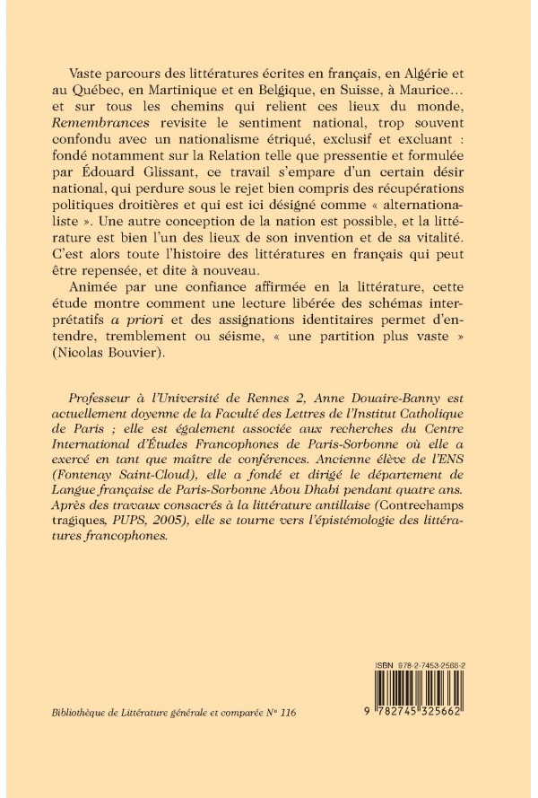 Vaste parcours des littératures écrites en français, en Algérie et au Québec, en Martinique et en Belgique, en Suisse, à Maurice… et sur tous les chemins qui relient ces lieux du monde, Remembrances revisite le sentiment national, trop souvent confondu avec un nationalisme étriqué, exclusif et excluant : fondé notamment sur la Relation telle que pressentie et formulée par Édouard Glissant, ce travail s’empare d’un certain désir national, qui perdure sous le rejet bien compris des récupérations politiques droitières et qui est ici désigné comme « alternationaliste». Une autre conception de la nation est possible, et la littérature est bien l’un des lieux de son invention et de sa vitalité. C’est alors toute l’histoire des littératures en français qui peut être repensée, et dite à nouveau.