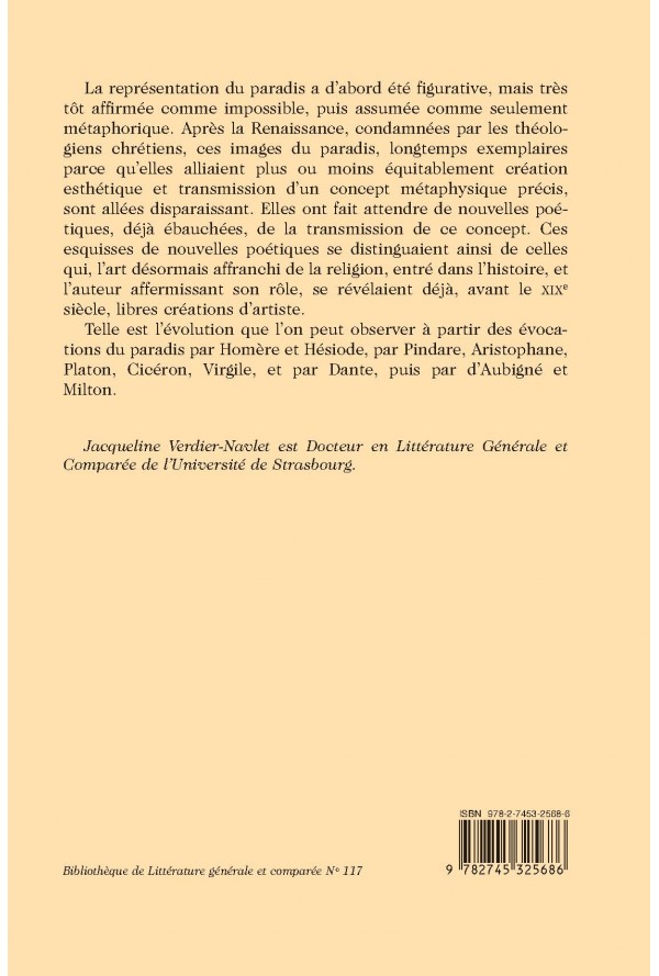 La représentation du paradis a d’abord été figurative, mais très tôt affirmée comme impossible, puis assumée comme seulement métaphorique. Après la Renaissance, condamnées par les théologiens chrétiens, ces images du paradis, longtemps exemplaires parce qu’elles alliaient plus ou moins équitablement création esthétique et transmission d’un concept métaphysique précis, sont allées disparaissant. Elles ont fait attendre de nouvelles poétiques, déjà ébauchées, de la transmission de ce concept. Ces esquisses de nouvelles poétiques se distinguaient ainsi de celles qui, l’art désormais affranchi de la religion, entré dans l’histoire, et l’auteur affermissant son rôle, se révélaient déjà, avant le XIXe siècle, libres créations d’artiste. Telle est l’évolution que l’on peut observer à partir des évocations du paradis par Homère et Hésiode, par Pindare, Aristophane, Platon, Cicéron, Virgile, et par Dante, puis par d’Aubigné et Milton.