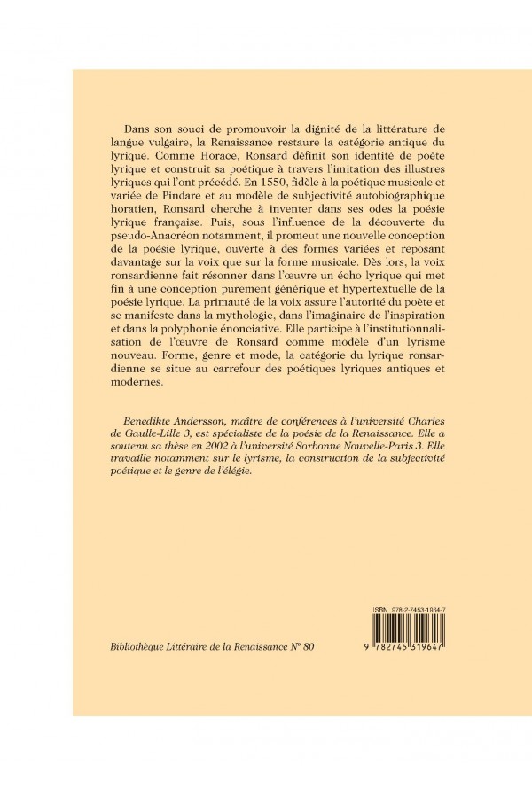 Dans son souci de promouvoir la dignité de la littérature de langue vulgaire, la Renaissance restaure la catégorie antique du lyrique. Comme Horace, Ronsard définit son identité de poète lyrique et construit sa poétique à travers l`imitation des illustres lyriques qui l`ont précédé. En 1550, fidèle à la poétique musicale et variée de Pindare et au modèle de subjectivité autobiographique horatien, Ronsard cherche à inventer dans ses odes la poésie lyrique française. Puis, sous l`influence de la découverte du pseudo-Anacréon notamment, il promeut une nouvelle conception de la poésie lyrique, ouverte à des formes variées et reposant davantage sur la voix que sur la forme musicale. Dès lors, la voix ronsardienne fait résonner dans l`œuvre un écho lyrique qui met fin à une conception purement générique et hypertextuelle de la poésie lyrique. La primauté de la voix assure l`autorité du poète et se manifeste dans la mythologie, dans l`imaginaire de l`inspiration et dans la polyphonie énonciative. Elle participe à l`institutionnalisation de l`œuvre de Ronsard comme modèle d`un lyrisme nouveau. Forme, genre et mode, la catégorie du lyrique ronsardienne se situe au carrefour des poétiques lyriques antiques et modernes. Benedikte Andersson, maître de conférences à l`université Charles de Gaulle-Lille 3, est spécialiste de la poésie de la Renaissance. Elle a soutenu sa thèse en 2002 à l`université Sorbonne Nouvelle-Paris 3. Elle travaille notamment sur le lyrisme, la construction de la subjectivité poétique et le genre de l`élégie.