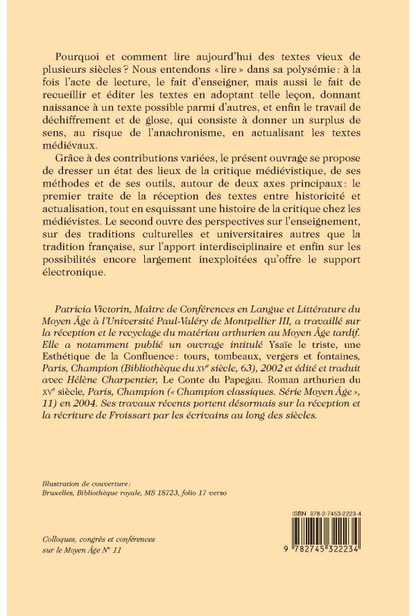 Pourquoi et comment lire aujourd`hui des textes vieux de plusieurs siècles ? Nous entendons " lire " dans sa polysémie : à la fois l`acte de lecture, le fait d`enseigner, mais aussi le fait de recueillir et éditer les textes en adoptant telle leçon, donnant naissance à un texte possible parmi d`autres, et enfin le travail de déchiffrement et de glose, qui consiste à donner un surplus de sens, au risque de l`anachronisme, en actualisant les textes médiévaux. Grâce à des contributions variées, le présent ouvrage se propose de dresser un état des lieux de la critique médiévistique, de ses méthodes et de ses outils, autour de deux axes principaux : le premier traite de la réception des textes entre historicité et actualisation, tout en esquissant une histoire de la critique chez les médiévistes. Le second ouvre des perspectives sur l`enseignement, sur des traditions culturelles et universitaires autres que la tradition française, sur l`apport interdisciplinaire et enfin sur les possibilités encore largement inexploitées qu`offre le support électronique. Patricia Victorin, Maître de Conférences en Langue et Littérature du Moyen Âge à l`Université Paul-Valéry de Montpellier III, a travaillé sur la réception et le recyclage du matériau arthurien au Moyen Âge tardif. Elle a notamment publié un ouvrage intitulé Ysaïe le triste, une Esthétique de la Confluence : tours, tombeaux, vergers et fontaines, Paris, Champion (Bibliothèque du XVe siècle, 63), 2002 et édité et traduit avec Hélène Charpentier, Le Conte du Papegau. Roman arthurien du XVe siècle, Paris, Champion (" Champion classiques. Série Moyen Âge ", 11) en 2004. Ses travaux récents portent désormais sur la réception et la récriture de Froissart par les écrivains au long des siècles.