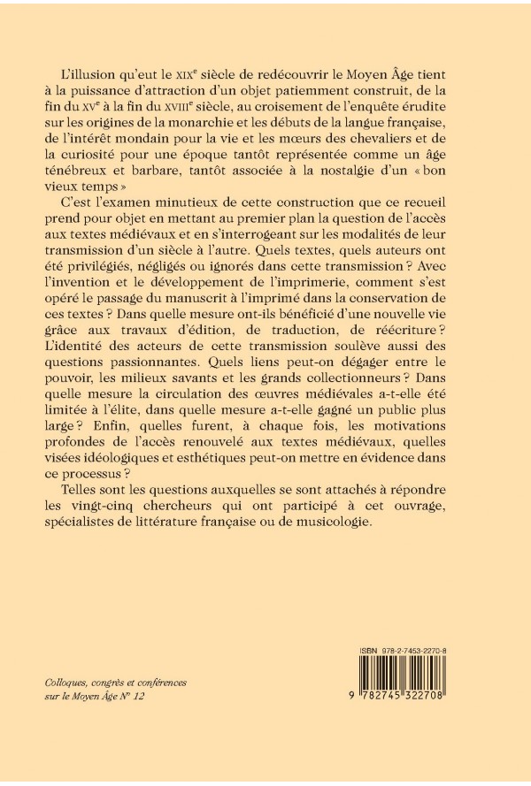 L’illusion qu’eut le XIXe siècle de redécouvrir le Moyen Âge tient à la puissance d’attraction d’un objet patiemment construit, de la fin du XVe à la fin du XVIIIe siècle, au croisement de l’enquête érudite sur les origines de la monarchie et les débuts de la langue française, de l’intérêt mondain pour la vie et les mœurs des chevaliers et de la curiosité pour une époque tantôt représentée comme un âge ténébreux et barbare, tantôt associée à la nostalgie d’un « bon vieux temps » C’est l’examen minutieux de cette construction que ce recueil prend pour objet en mettant au premier plan la question de l’accès aux textes médiévaux et en s’interrogeant sur les modalités de leur transmission d’un siècle à l’autre. Quels textes, quels auteurs ont été privilégiés, négligés ou ignorés dans cette transmission ? Avec l’invention et le développement de l’imprimerie, comment s’est opéré le passage du manuscrit à l’imprimé dans la conservation de ces textes ? Dans quelle mesure ont-ils bénéficié d’une nouvelle vie grâce aux travaux d’édition, de traduction, de réécriture ? L’identité des acteurs de cette transmission soulève aussi des questions passionnantes. Quels liens peut-on dégager entre le pouvoir, les milieux savants et les grands collectionneurs? Dans quelle mesure la circulation des œuvres médiévales a-t-elle été limitée à l’élite, dans quelle mesure a-t-elle gagné un public plus large ? Enfin, quelles furent, à chaque fois, les motivations profondes de l’accès renouvelé aux textes médiévaux, quelles visées idéologiques et esthétiques peut-on mettre en évidence dans ce processus? Telles sont les questions auxquelles se sont attachés à répondre les vingt-cinq chercheurs qui ont participé à cet ouvrage, spécialistes de littérature française ou de musicologie.