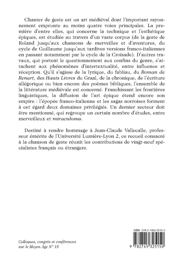 CHANTER DE GESTE L’ART ÉPIQUE ET SON RAYONNEMENT HOMMAGE À JEAN-CLAUDE VALLECALLE