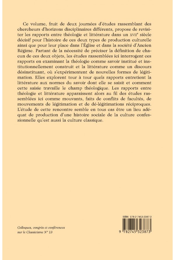 Ce volume, fruit de deux journées d’études rassemblant des chercheurs d’horizons disciplinaires différents, propose de revisiter les rapports entre théologie et littérature dans un XVIIe siècle décisif pour l’histoire de ces deux types de production culturelle ainsi que pour leur place dans l’Église et dans la société d’Ancien Régime. Partant de la nécessité de préciser la définition de chacun de ces deux objets, les études rassemblées ici interrogent ces rapports en examinant la théologie comme savoir institué et institutionnellement construit et la littérature comme un discours désinstituant, où s’expérimentent de nouvelles formes de légitimation. Elles explorent tour à tour quels rapports entretient la littérature aux normes du savoir dont elle se saisit et comment cette saisie travaille le champ théologique. Les rapports entre théologie et littérature apparaissent alors au fil des études rassemblées ici comme mouvants, faits de conflits de facultés, de mouvements de légitimation et de dé-légitimations réciproques. L’étude de cette rencontre semble en tous cas être un lieu adéquat de production d’une histoire sociale de la culture confessionnelle qu’est aussi la culture classique.