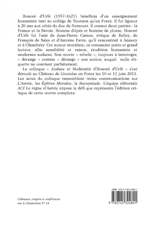 Honoré d’Urfé (1557-1627) bénéficia d’un enseignement humaniste tant au collège de Tournon qu’en Forez. Il fut ligueur à 20 ans aux côtés du duc de Nemours. Il connut deux patries : la France et la Savoie. Homme d’épée et homme de plume, Honoré d’Urfé fut l’ami de Jean-Pierre Camus, évêque de Belley, de François de Sales et d’Antoine Favre, qu’il rencontrait à Annecy et à Chambéry. Cet auteur moraliste, ce romancier poète et grand lecteur, allie sensibilité et raison, érudition humaniste et modernes audaces. Son œuvre « rebelle », toujours à interroger, « dérange » comme « dérange » son auteur, auquel nulle étiquette ne convient parfaitement. Le colloque « Audace et Modernité d’Honoré d’Urfé » s’est déroulé au Château de Goutelas en Forez les 10 et 11 juin 2011. Les actes du colloque rassemblent treize communications sur « L’Astrée », les « Épîtres Morales », la « Savoysiade ». L’équipe éditoriale ACI Le règne d’Astrée expose le défi que représente l’édition critique de cette œuvre complexe.
