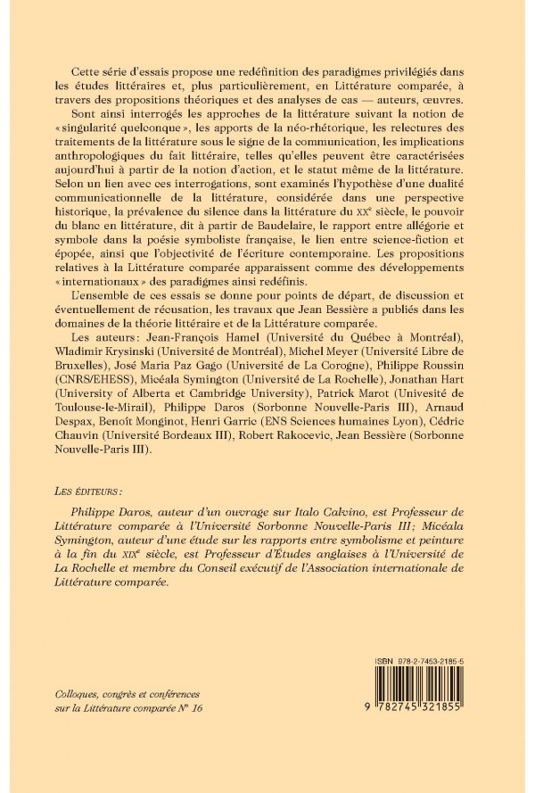 Cette série d’essais propose une redéfinition des paradigmes privilégiés dans les études littéraires et, plus particulièrement, en Littérature comparée, à travers des propositions théoriques et des analyses de cas – auteurs, œuvres. Sont ainsi interrogés les approches de la littérature suivant la notion de « singularité quelconque », les apports de la néo-rhétorique, les relectures des traitements de la littérature sous le signe de la communication, les implications anthropologiques du fait littéraire, telles qu’elles peuvent être caractérisées aujourd’hui à partir de la notion d’action, et le statut même de la littérature. Selon un lien avec ces interrogations, sont examinés l’hypothèse d’une dualité communicationnelle de la littérature, considérée dans une perspective historique, la prévalence du silence dans la littérature du XXe siècle, le pouvoir du blanc en littérature, dit à partir de Baudelaire, le rapport entre allégorie et symbole dans la poésie symboliste française, le lien entre science-fiction et épopée, ainsi que l’objectivité de l’écriture contemporaine. Les propositions relatives à la Littérature comparée apparaissent comme des développements « internationaux » des paradigmes ainsi redéfinis. L’ensemble de ces essais se donne pour points de départ, de discussion et éventuellement de récusation, les travaux que Jean Bessière a publiés dans les domaines de la théorie littéraire et de la Littérature comparée.