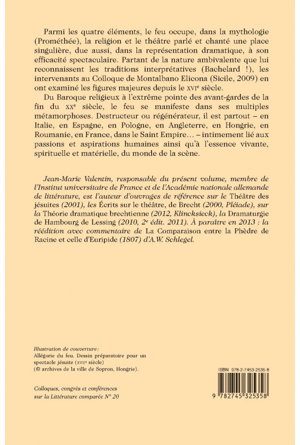 Jean-Marie Valentin, responsable du présent volume, membre de l’Institut universitaire de France et de l’Académie nationale allemande de littérature, est l’auteur d’ouvrages de référence sur le « Théâtre des jésuites » (2001), les « Écrits sur le théâtre, de Brecht » (2000, Pléiade), sur la « Théorie dramatique brechtienne » (2012, Klincksieck), la « Dramaturgie de Hambourg de Lessing » (2010, 2e édit. 2011). À paraître en 2013 : la réédition avec commentaire de « La Comparaison entre la Phèdre de Racine et celle d’Euripide » (1807) d’A.W. Schlegel.