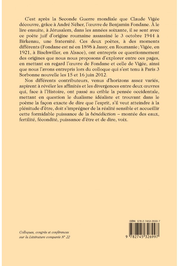 C’est après la Seconde Guerre mondiale que Claude Vigée découvre, grâce à André Néher, l’œuvre de Benjamin Fondane. À le lire ensuite, à Jérusalem, dans les années soixante, il se sent avec ce poète juif d’origine roumaine assassiné le 3 octobre 1944 à Birkenau, une fraternité. Ces deux poètes, à des moments différents (Fondane est né en 1898 à Jassy, en Roumanie ; Vigée, en 1921, à Bischwiller, en Alsace), ont entrepris ce questionnement des origines que nous nous proposons d’explorer entre ces pages, en mettant en regard l’œuvre de Fondane et celle de Vigée, ainsi que nous l’avons entrepris lors du colloque qui s’est tenu à Paris 3 Sorbonne nouvelle les 15 et 16 juin 2012. Nos différents contributeurs, venus d’horizons assez variés, aspirent à révéler les affinités et les divergences entre deux œuvres qui, face à l’Histoire, ont passé au crible la pensée occidentale, mettant en question le dualisme idéaliste et trouvant dans le poème la façon exacte de dire que l’esprit, s’il veut atteindre à la plénitude d’être, doit s’imprégner de la réalité sensible et accueillir cette formidable puissance de la bénédiction – montée des eaux, fertilité, fécondité, puissance d’être et de dire, voix.