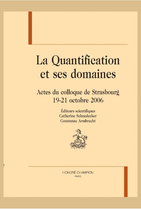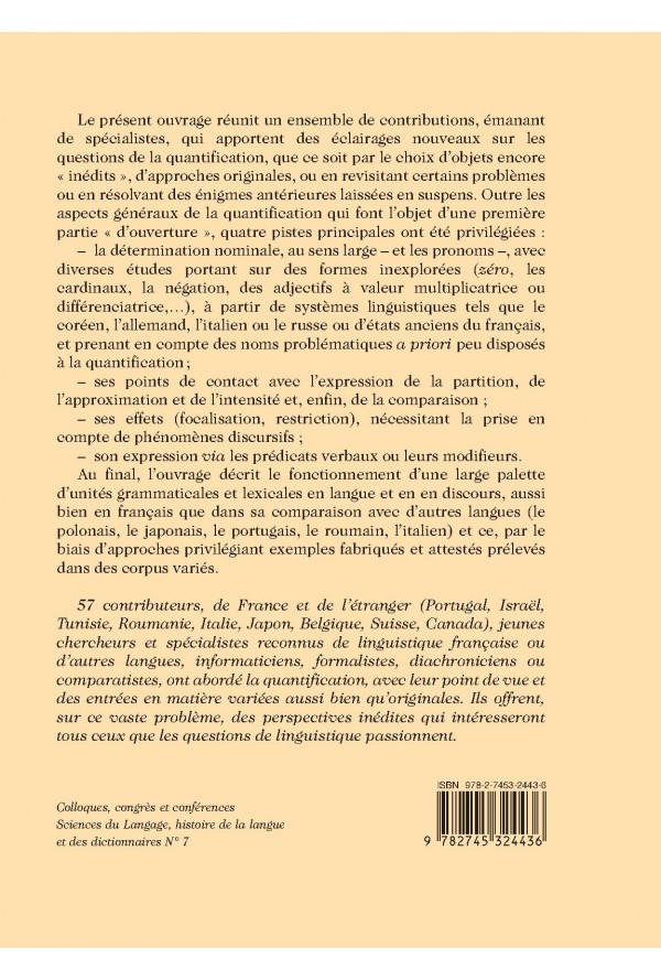 Le présent ouvrage réunit un ensemble de contributions, émanant de spécialistes, qui apportent des éclairages nouveaux sur les questions de la quantification, que ce soit par le choix d’objets encore « inédits », d’approches originales, ou en revisitant certains problèmes ou en résolvant des énigmes antérieures laissées en suspens. Outre les aspects généraux de la quantification qui font l’objet d’une première partie « d’ouverture », quatre pistes principales ont été privilégiées : – la détermination nominale, au sens large – et les pronoms –, avec diverses études portant sur des formes inexplorées (zéro, les cardinaux, la négation, des adjectifs à valeur multiplicatrice ou différenciatrice,…), à partir de systèmes linguistiques tels que le coréen, l’allemand, l’italien ou le russe ou d’états anciens du français, et prenant en compte des noms problématiques a priori peu disposés à la quantification ; – ses points de contact avec l’expression de la partition, de l’approximation et de l’intensité et, enfin, de la comparaison ; – ses effets (focalisation, restriction), nécessitant la prise en compte de phénomènes discursifs ; – son expression via les prédicats verbaux ou leurs modifieurs. Au final, l’ouvrage décrit le fonctionnement d’une large palette d’unités grammaticales et lexicales en langue et en en discours, aussi bien en français que dans sa comparaison avec d’autres langues (le polonais, le japonais, le portugais, le roumain, l’italien) et ce, par le biais d’approches privilégiant exemples fabriqués et attestés prélevés dans des corpus variés.