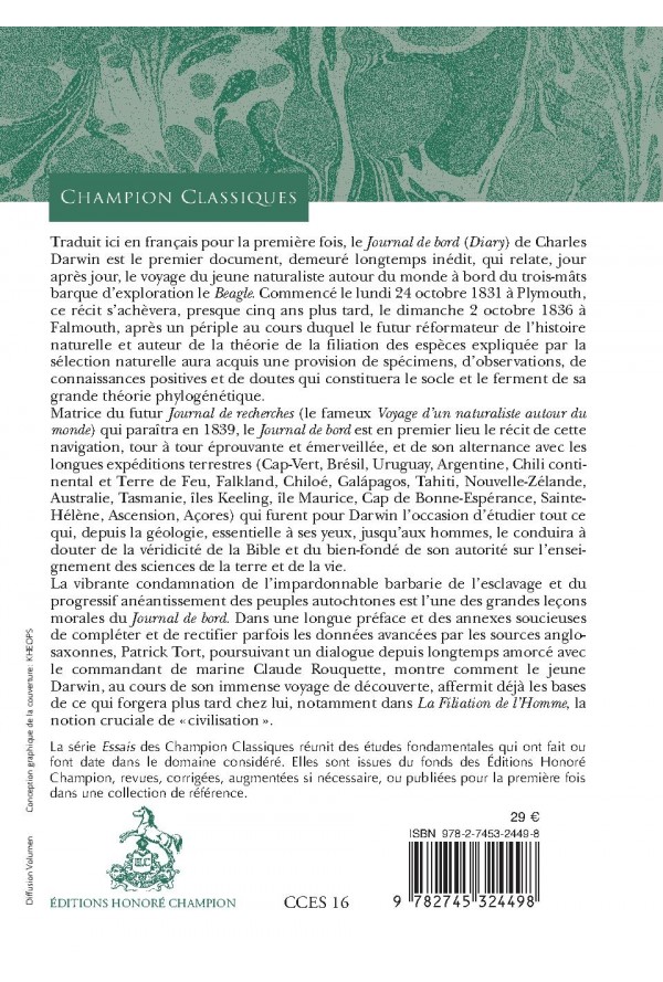 Traduit ici en français pour la première fois, le Journal de bord (Diary) de Charles Darwin est le premier document, demeuré longtemps inédit, qui relate, jour après jour, le voyage du jeune naturaliste autour du monde à bord du trois-mâts barque d’exploration le Beagle. Commencé le lundi 24 octobre 1831 à Plymouth, ce récit s’achèvera, presque cinq ans plus tard, le dimanche 2 octobre 1836 à Falmouth, après un périple au cours duquel le futur réformateur de l’histoire naturelle et auteur de la théorie de la filiation des espèces expliquée par la sélection naturelle aura acquis une provision de spécimens, d’observations, de connaissances positives et de doutes qui constituera le socle et le ferment de sa grande théorie phylogénétique. Matrice du futur Journal de recherches (le fameux Voyage d’un naturaliste autour du monde) qui paraîtra en 1839, le Journal de bord est en premier lieu le récit de cette navigation, tour à tour éprouvante et émerveillée, et de son alternance avec les longues expéditions terrestres (Cap-Vert, Brésil, Uruguay, Argentine, Chili continental et Terre de Feu, Falkland, Chiloé, Galápagos, Tahiti, Nouvelle-Zélande, Australie, Tasmanie, îles Keeling, île Maurice, Cap de Bonne-Espérance, Sainte- Hélène, Ascension, Açores) qui furent pour Darwin l’occasion d’étudier tout ce qui, depuis la géologie, essentielle à ses yeux, jusqu’aux hommes, le conduira à douter de la véridicité de la Bible et du bien-fondé de son autorité sur l’enseignement des sciences de la terre et de la vie. La vibrante condamnation de l’impardonnable barbarie de l’esclavage et du progressif anéantissement des peuples autochtones est l’une des grandes leçons morales du Journal de bord.