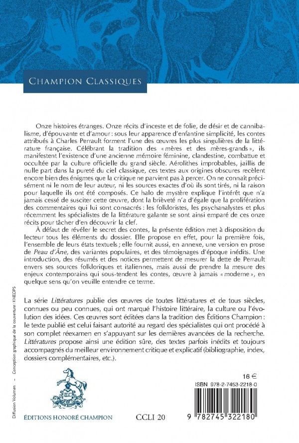 Onze histoires étranges. Onze récits d’inceste et de folie, de désir et de cannibalisme, d’épouvante et d’amour : sous leur apparence d’enfantine simplicité, les contes attribués à Charles Perrault forment l’une des œuvres les plus singulières de la littérature française. Célébrant la tradition des «mères et des mères-grands », ils manifestent l’existence d’une ancienne mémoire féminine, clandestine, combattue et occultée par la culture officielle du grand siècle. Aérolithes improbables, jaillis de nulle part dans la pureté du ciel classique, ces textes aux origines obscures recèlent encore bien des énigmes que la critique ne parvient pas à percer. On ne connaît précisément ni le nom de leur auteur, ni les sources exactes d’où ils sont tirés, ni la raison pour laquelle ils ont été composés. Ce halo de mystère explique l’intérêt que n’a jamais cessé de susciter cette œuvre, dont la brièveté n’a d’égale que la prolifération des commentaires qui lui sont consacrés : les folkloristes, les psychanalystes et plus récemment les spécialistes de la littérature galante se sont ainsi emparé de ces onze récits pour tâcher d’en découvrir la clef. À défaut de révéler le secret des contes, la présente édition met à disposition du lecteur tous les éléments du dossier. Elle propose en effet, pour la première fois, l’ensemble de leurs états textuels ; elle fournit aussi, en annexe, une version en prose de Peau d’Âne, des variantes populaires, et des témoignages d’époque inédits. Une introduction, des résumés et des notices permettent de mesurer la dette de Perrault envers ses sources folkloriques et italiennes, mais aussi de prendre la mesure des enjeux contemporains qui sous-tendent les contes, œuvre à jamais « moderne », en quelque sens qu’on veuille entendre ce terme.