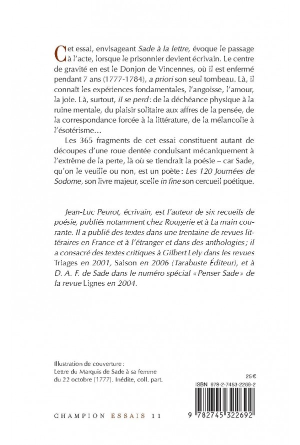 Cet essai, envisageant Sade à la lettre, évoque le passage à l’acte, lorsque le prisonnier devient écrivain. Le centre de gravité en est le Donjon de Vincennes, où il est enfermé pendant 7 ans (1777-1784), a priori son seul tombeau. Là, il connaît les expériences fondamentales, l’angoisse, l’amour, la joie. Là, surtout, il se perd : de la déchéance physique à la ruine mentale, du plaisir solitaire aux affres de la pensée, de la correspondance forcée à la littérature, de la mélancolie à l’ésotérisme… Les 365 fragments de cet essai constituent autant de découpes d’une roue dentée conduisant mécaniquement à l’extrême de la perte, là où se tiendrait la poésie – car Sade, qu’on le veuille ou non, est un poète : Les 120 Journées de Sodome, son livre majeur, scelle in fine son cercueil poétique. Jean-Luc Peurot, écrivain, est l’auteur de six recueils de poésie, publiés notamment chez Rougerie et à La main courante. Il a publié des textes dans une trentaine de revues littéraires en France et à l’étranger et dans des anthologies ; il a consacré des textes critiques à Gilbert Lely dans les revues Triages en 2001, Saison en 2006 (Tarabuste Éditeur), et à D. A. F. de Sade dans le numéro spécial «Penser Sade » de la revue Lignes en 2004.