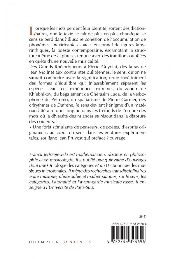 Lorsque les mots perdent leur identité, sortent des dictionnaires, que le texte se fait de plus en plus chaotique, le sens se perd dans l`illusoire cohésion de l`accumulation de phonèmes. Inextricable espace tensionnel de figures labyrinthiques, la poésie contemporaine, escamotant la structure même de la phrase, renoue avec des traditions oubliées en quête d`une nouvelle musicalité. Des Grands Rhétoriqueurs à Pierre Guyotat, des fatras de Jean Molinet aux contraintes oulipiennes, le sens, qu`on ne saurait confondre avec la signification, noue indéfiniment des formes d`équilibre qui inlassablement séparent les espèces. Dans ces expériences extrêmes, du zaoum de Khlebnikov, du égaiement de Ghérasim Luca, de la verbophonie de Pétronio, du spatialisme de Pierre Garnier, des crirythmes de Dufrêne, le sens devient l`énigme d`un matériau littéraire qui s`origine dans les tréfonds de l`ombre des mots où la diversité des nuances se résout dans la diaprure des couleurs. « Une forêt stimulante de penseurs, de poètes, d’esprits originaux », au cœur du sens dans les écritures expérimentales, souligne Jean Pruvost qui face l’ouvrage.