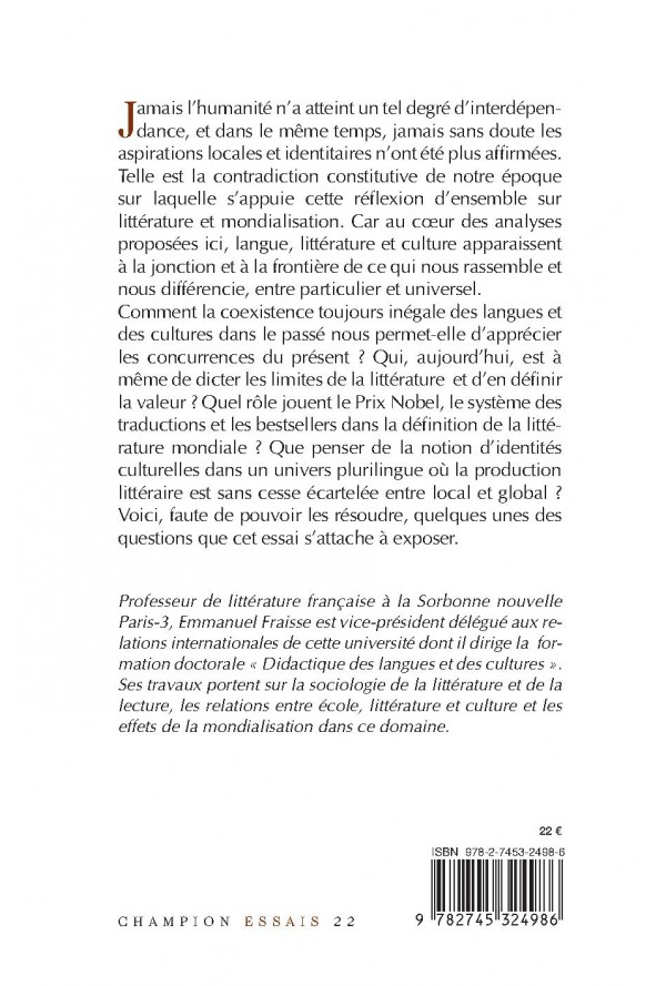 Jamais l’humanité n’a atteint un tel degré d’interdépendance, et dans le même temps, jamais sans doute les aspirations locales et identitaires n’ont été plus affirmées. Telle est la contradiction constitutive de notre époque sur laquelle s’appuie cette réflexion d’ensemble sur littérature et mondialisation. Car au coeur des analyses proposées ici, langue, littérature et culture apparaissent à la jonction et à la frontière de ce qui nous rassemble et nous différencie, entre particulier et universel. Comment la coexistence toujours inégale des langues et des cultures dans le passé nous permet-elle d’apprécier les concurrences du présent ? Qui, aujourd’hui, est à même de dicter les limites de la littérature et d’en définir la valeur ? Quel rôle jouent le Prix Nobel, le système des traductions et les bestsellers dans la définition de la littérature mondiale ? Que penser de la notion d’identités culturelles dans un univers plurilingue où la production littéraire est sans cesse écartelée entre local et global ? Voici, faute de pouvoir les résoudre, quelques unes des questions que cet essai s’attache à exposer. Professeur de littérature française à la Sorbonne nouvelle Paris-3, Emmanuel Fraisse est vice-président délégué aux relations internationales de cette université dont il dirige la formation doctorale « Didactique des langues et des cultures ». Ses travaux portent sur la sociologie de la littérature et de la lecture, les relations entre école, littérature et culture et les effets de la mondialisation dans ce domaine.