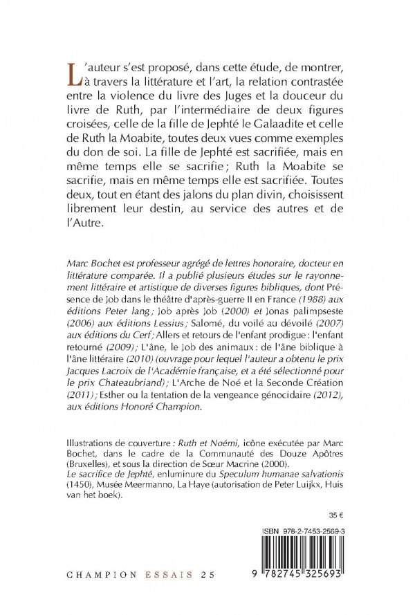 L’auteur s’est proposé, dans cette étude, de montrer, à travers la littérature et l’art, l’étroite relation contrastée entre la violence du livre des Juges et la douceur du livre de Ruth, par l’intermédiaire de deux figures croisées, celle de la fille de Jephté le Galaadite et celle de Ruth la Moabite, toutes deux vues comme exemples du don de soi : la fille de Jephté est sacrifiée, mais en même temps elle se sacrifie ; Ruth la Moabite se sacrifie, mais en même temps elle est sacrifiée. Toutes deux, tout en étant des jalons du plan divin, choisissent librement leurs destins, au service des autres et de l’Autre.