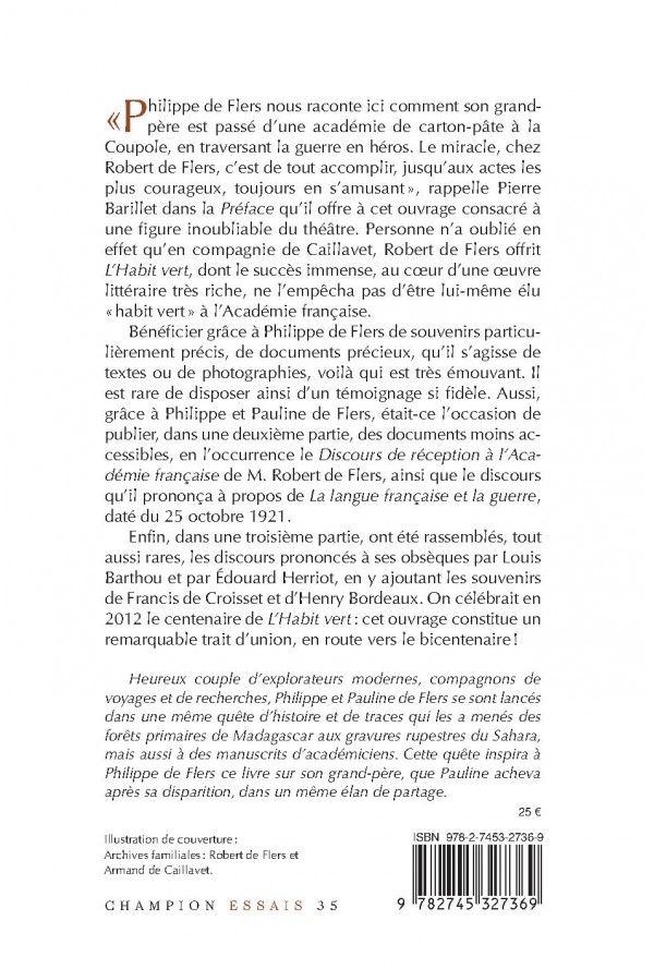 « Philippe de Flers nous raconte ici comment son grand-père est passé d’une académie de carton-pâte à la Coupole, en traversant la guerre en héros. Le miracle, chez Robert de Flers, c’est de tout accomplir, jusqu’aux actes les plus courageux, toujours en s’amusant », rappelle Pierre Barillet dans la Préface qu’il offre à cet ouvrage consacré à une figure inoubliable du théâtre. Personne n’a oublié en effet qu’en compagnie de Caillavet, Robert de Flers offrit L’Habit vert, dont le succès immense, au cœur d’une œuvre littéraire très riche, ne l’empêcha pas d’être lui-même élu «habit vert » à l’Académie française. Bénéficier grâce à Philippe de Flers de souvenirs particulièrement précis, de documents précieux, qu’il s’agisse de textes ou de photographies, voilà qui est très émouvant. Il est rare de disposer ainsi d’un témoignage si fidèle. Aussi, grâce à Philippe et Pauline de Flers, était-ce l’occasion de publier, dans une deuxième partie, des documents moins accessibles, en l’occurrence le Discours de réception à l'Académie française de M. Robert de Flers, ainsi que le discours qu’il prononça à propos de La langue française et la guerre, daté du 25 octobre 1921. Enfin, dans une troisième partie, ont été rassemblés, tout aussi rares, les discours prononcés à ses obsèques par Louis Barthou et par Édouard Herriot, en y ajoutant les souvenirs de Francis de Croisset et d’Henry Bordeaux. On célébrait en 2012 le centenaire de « L’Habit vert » : cet ouvrage constitue un remarquable trait d’union, en route vers le bicentenaire !