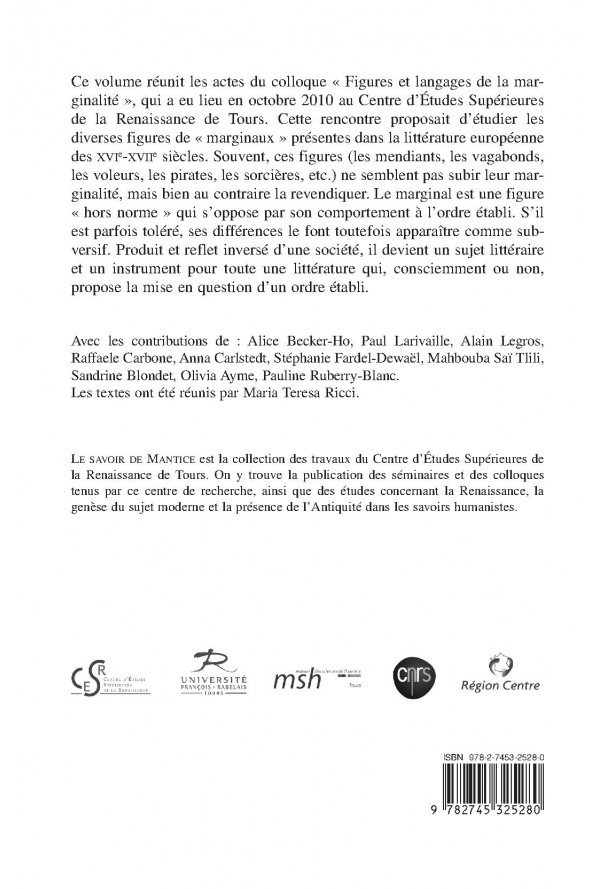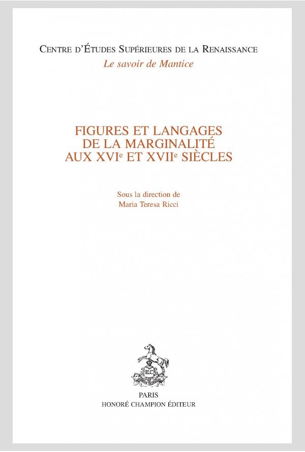 Ce volume réunit les actes du colloque « Figures et langages de la marginalité », qui a eu lieu en octobre 2010 au Centre d’Études Supérieures de la Renaissance de Tours. Cette rencontre proposait d’étudier les diverses figures de « marginaux » présentes dans la littérature européenne des XVIe-XVIIe siècles. Souvent, ces figures (les mendiants, les vagabonds, les voleurs, les pirates, les sorcières, etc.) ne semblent pas subir leur marginalité, mais bien au contraire la revendiquer. Le marginal est une figure « hors norme » qui s’oppose par son comportement à l’ordre établi. S’il est parfois toléré, ses différences le font toutefois apparaître comme subversif. Produit et reflet inversé d’une société, il devient un sujet littéraire et un instrument pour toute une littérature qui, consciemment ou non, propose la mise en question d’un ordre établi.
