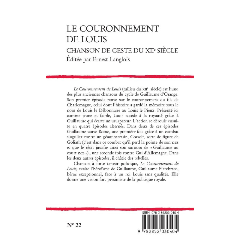 COURONNEMENT DE LOUIS -LE-. CHANSON DE GESTE DU XIIE SIECLE.