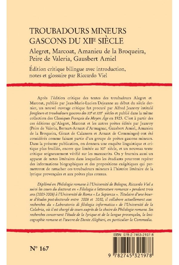 Après l`édition critique des textes des troubadours Alegret et Marcoat, publiée par Jean-Marie-Lucien Dejeanne au début du siècle dernier, un nouvel ouvrage critique fut procuré par Alfred Jeanroy intitulé Jongleurs et troubadours gascons des XIIe et XIIIe siècles et publié dans la même collection des Classiques Français du Moyen Âge en 1923. C`est à partir des ces éditions qu`Alegret, Marcoat et les autres poètes édités par Jeanroy (Peire de Valeria, Bernart-Arnaut d`Armagnac, Gausbert Amiel, Amanieu de la Broqueira, Giraut de Calanson et Arnaut de Comminges) ont été considérés comme faisant partie d`un groupe de poètes gascons mineurs. Dans la présente publication, on donnera une enquête linguistique et critique plus fouillée, encore que limitée au XIIe siècle, et un nouveau texte critique soigneusement vérifié sur les manuscrits. On y fournira aussi un apparat de notes littéraires dans lesquelles les étudiants pourront repérer des informations biographiques et des propositions exégétiques qui permettront de rattacher ces troubadours mineurs à l`histoire littéraire de la lyrique provençales et aux poètes plus connus. Diplômé en Philologie romane à l`Université de Bologne, Riccardo Viel a suivi les cours du doctorat en " Filologia e letterature romanze " pendant trois ans (2005-2008) à l`Université de Roma " La Sapienza ". Titulaire d`une bourse d`études post-doctorale entre 2008 et 2010, il collabore actuellement aux recherches du " Laboratorio di filologia informatica " de l`Université de la Calabria, où il est chargé de cours auprès de la chaire de Philologie romane. Ses recherches concernent l`étude de la lyrique et de la langue provençales, la lexicographie romane et l`oeuvre de Dante Alighieri, en particulier la Commedia