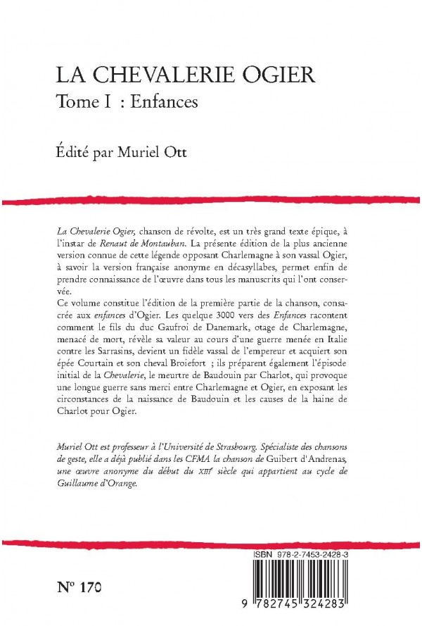 La Chevalerie Ogier, chanson de révolte, est un très grand texte épique, à l’instar de Renaut de Montauban. La présente édition de la plus ancienne version connue de cette légende opposant Charlemagne à son vassal Ogier, à savoir la version française anonyme en décasyllabes, permet enfin de prendre connaissance de l’œuvre dans tous les manuscrits qui l’ont conservée. Ce volume constitue l’édition de la première partie de la chanson, consacrée aux enfances d’Ogier. Les quelque 3000 vers des Enfances racontent comment le fils du duc Gaufroi de Danemark, otage de Charlemagne, menacé de mort, révèle sa valeur au cours d’une guerre menée en Italie contre les Sarrasins, devient un fidèle vassal de l’empereur et acquiert son épée Courtain et son cheval Broiefort; ils préparent également l’épisode initial de la Chevalerie, le meurtre de Baudouin par Charlot, qui provoque une longue guerre sans merci entre Charlemagne et Ogier, en exposant les circonstances de la naissance de Baudouin et les causes de la haine de Charlot pour Ogier.