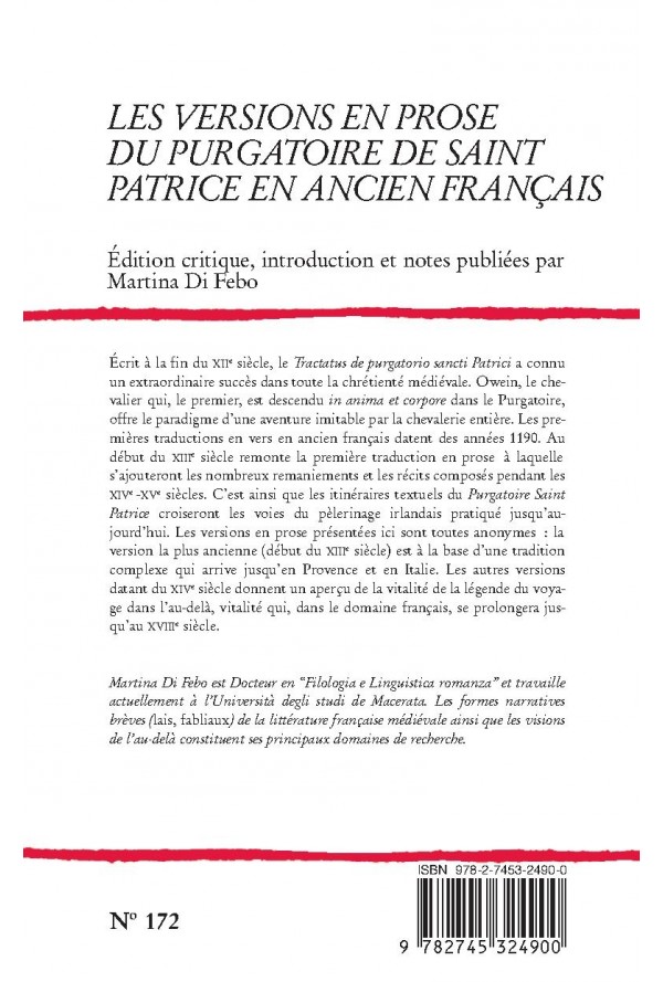 Écrit à la fin du XIIe siècle, le « Tractatus de purgatorio sancti Patrici » a connu un extraordinaire succès dans toute la chrétienté médiévale. Owein, le chevalier qui, le premier, est descendu in anima et corpore dans le Purgatoire, offre le paradigme d’une aventure imitable par la chevalerie entière. Les premières traductions en vers en ancien français datent des années 1190. Au début du XIIIe siècle remonte la première traduction en prose à laquelle s’ajouteront les nombreux remaniements et les récits composés pendant les XIVe -XVe siècles. C’est ainsi que les itinéraires textuels du « Purgatoire Saint Patrice » croiseront les voies du pèlerinage irlandais pratiqué jusqu’aujourd’hui. Les versions en prose présentées ici sont toutes anonymes : la version la plus ancienne (début du XIIIe siècle) est à la base d’une tradition complexe qui arrive jusqu’en Provence et en Italie. Les autres versions datant du XIVe siècle donnent un aperçu de la vitalité de la légende du voyage dans l’au-delà, vitalité qui, dans le domaine français, se prolongera jusqu’au XVIIIe siècle.