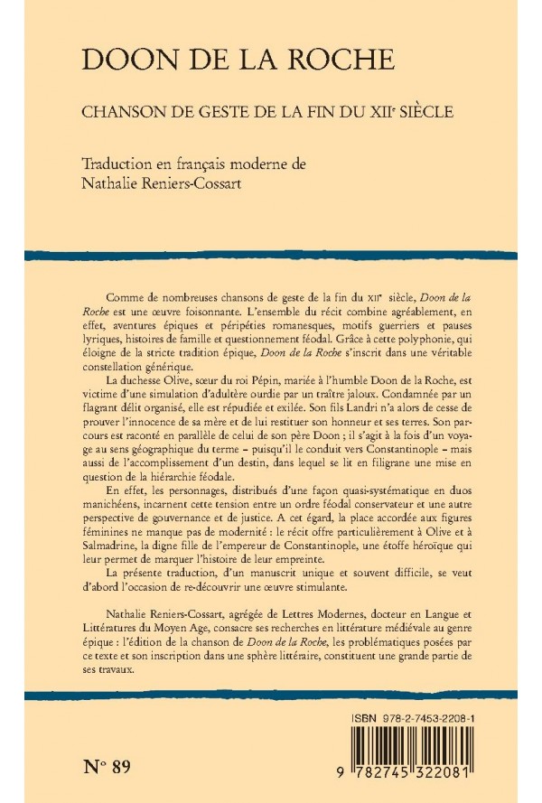 Comme de nombreuses chansons de geste de la fin du XIIe siècle, Doon de la Roche est une œuvre foisonnante. L`ensemble du récit combine agréablement, en effet, aventures épiques et péripéties romanesques, motifs guerriers et pauses lyriques, histoires de famille et questionnement féodal. Grâce à cette polyphonie, qui éloigne de la stricte tradition épique, Doon de la Roche s`inscrit dans une véritable constellation générique. La duchesse Olive, soeur du roi Pépin, mariée à l`humble Doon de la Roche, est victime d`une simulation d`adultère ourdie par un traître jaloux. Condamnée par un flagrant délit organisé, elle est répudiée et exilée. Son fils Landri n`a alors de cesse de prouver l`innocence de sa mère et de lui restituer son honneur et ses terres. Son parcours est raconté en parallèle de celui de son père Doon ; il s`agit à la fois d`un voyage au sens géographique du terme - puisqu`il le conduit vers Constantinople - mais aussi de l`accomplissement d`un destin, dans lequel se lit en filigrane une mise en question de la hiérarchie féodale. En effet, les personnages, distribués d`une façon quasi-systématique en duos manichéens, incarnent cette tension entre un ordre féodal conservateur et une autre perspective de gouvernance et de justice. A cet égard, la place accordée aux figures féminines ne manque pas de modernité : le récit offre particulièrement à Olive et à Salmadrine, la digne fille de l`empereur de Constantinople, une étoffe héroïque qui leur permet de marquer l`histoire de leur empreinte. La présente traduction, d`un manuscrit unique et souvent difficile, se veut d`abord l`occasion de re-découvrir une œuvre stimulante. Nathalie Reniers-Cossart, agrégée de Lettres Modernes, docteur en Langue et Littératures du Moyen Age, consacre ses recherches en littérature médiévale au genre épique : l`édition de la chanson de Doon de la Roche, les problématiques posées par ce texte et son inscription dans une sphère littéraire, constituent une grande partie de ses travaux.