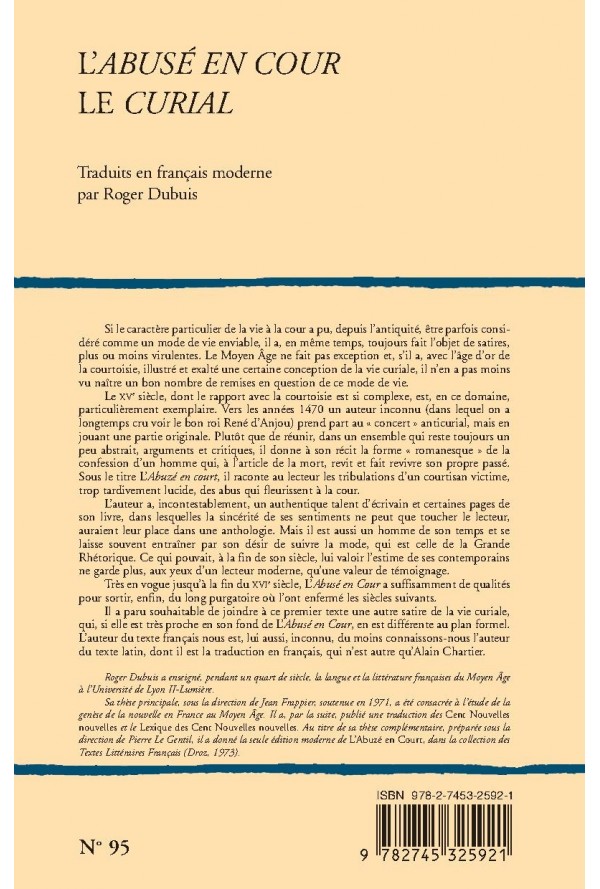 Il a paru souhaitable de joindre à ce premier texte une autre satire de la vie curiale, qui, si elle est très proche en son fond de L’Abusé en Cour, en est différente au plan formel. L’auteur du texte français nous est, lui aussi, inconnu, du moins connaissons-nous l’auteur du texte latin, dont il est la traduction en français, qui n’est autre qu’Alain Chartier.