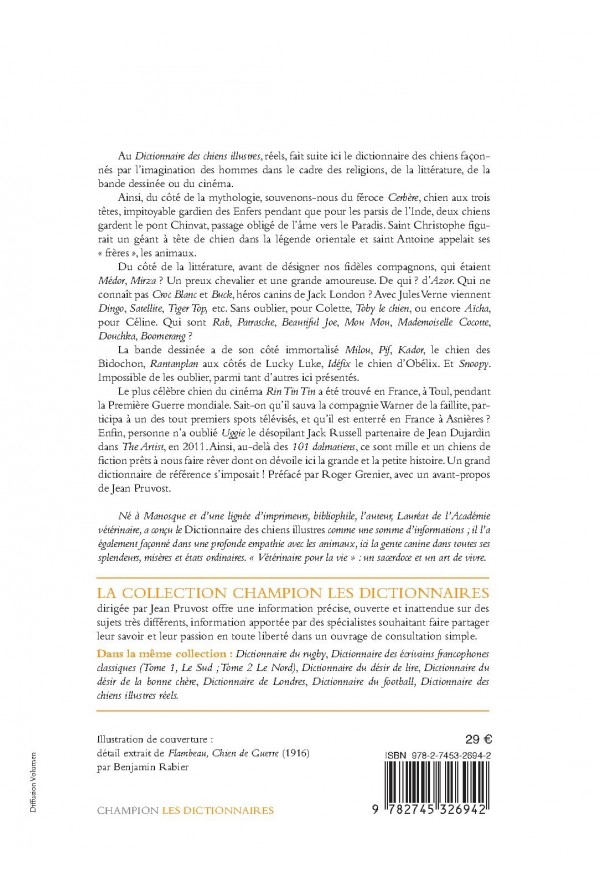 Du côté de la littérature, avant de désigner nos fidèles compagnons, qui étaient « Médor, Mirza »? Un preux chevalier et une grande amoureuse. De qui ? d’ « Azor ». Qui ne connaît pas « Croc Blanc » et « Buck », héros canins de Jack London ? Avec Jules Verne viennent « Dingo », « Satellite », « Tiger Top », etc. Sans oublier, pour Colette, « Toby le chien », ou encore « Aïcha », pour Céline. Qui sont « Rab, Patrasche, Beautiful Joe, Mou Mou, Mademoiselle Cocotte, Douchka, Boomerang » ? La bande dessinée a de son côté immortalisé « Milou », « Pif », « Kador », le chien des Bidochon, « Rantanplan » aux côtés de Lucky Luke, « Idéfix » le chien d’Obélix. Et « Snoopy ». Impossible de les oublier, parmi tant d’autres ici présentés. Le plus célèbre chien du cinéma « Rin Tin Tin » a été trouvé en France, à Toul, pendant la Première Guerre mondiale. Sait-on qu’il sauva la compagnie Warner de la faillite, participa à un des tout premiers spots télévisés, et qu’il est enterré en France à Asnières ? Enfin, personne n’a oublié « Uggie » le désopilant Jack Russell partenaire de Jean Dujardin dans « The Artist », en 2011. Ainsi, au-delà des « 101 dalmatiens », ce sont mille et un chiens de fiction prêts à nous faire rêver dont on dévoile ici la grande et la petite histoire. Un grand dictionnaire de référence s’imposait ! Préfacé par Roger Grenier, avec un avant-propos de Jean Pruvoost.