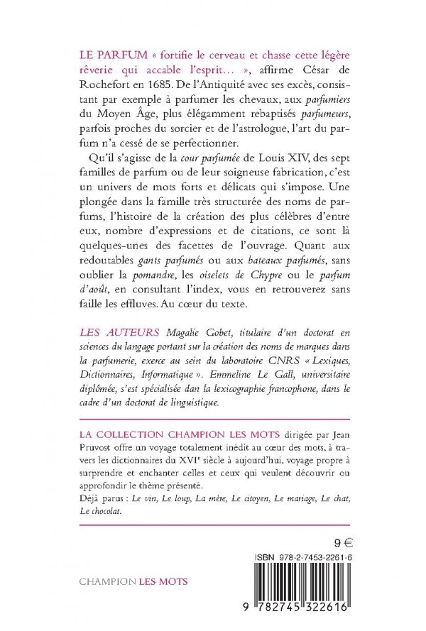 LE PARFUM " fortifie le cerveau et chasse cette légère rêverie qui accable l`esprit... ", affirme César de Rochefort en 1685. De l`Antiquité avec ses excès, consistant par exemple à parfumer les chevaux, aux parfumiers du Moyen Âge, plus élégamment rebaptisés parfumeurs, parfois proches du sorcier et de l`astrologue, l`art du parfum n`a cessé de se perfectionner. Qu`il s`agisse de la cour parfumée de Louis XIV, des sept familles de parfum ou de leur soigneuse fabrication, c`est un univers de mots forts et délicats qui s`impose. Une plongée dans la famille très structurée des noms de parfums, l`histoire de la création des plus célèbres d`entre eux, nombre d`expressions et de citations, ce sont là quelques-unes des facettes de l`ouvrage. Quant aux redoutables gants parfumés ou aux bateaux parfumés, sans oublier la pomandre, les oiselets de Chypre ou le parfum d`août, en consultant l`index, vous en retrouverez sans faille les effluves. Au cœur du texte. LES AUTEURS. Magalie Gobet, titulaire d`un doctorat en sciences du langage portant sur la création des noms de marques dans la parfumerie, exerce au sein du laboratoire CNRS "Lexiques, Dictionnaires, Informatique". Emmeline Le Gall, universitaire diplômée, s`est spécialisée dan la lexicographie francophone, dans le cadre d`un doctorat de linguistique. LA COLLECTION CHAMPION LES MOTS dirigée par Jean Pruvost offre un voyage totalement inédit au cœur des mots, à travers les dictionnaires du XVIe siècle à aujourd`hui, voyage propre à surprendre et enchanter celles et ceux qui veulent découvrir ou approfondir le thème présenté. Déjà parus: Le vin, Le loup, La mère, Le citoyen, Le mariage, Le chat, Le chocolat.