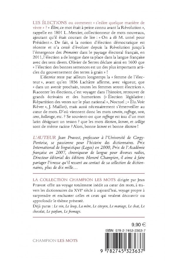 « Élire, ce mot était à peine connu avant la Révolution », rappelle en 1801 L. Mercier, collectionneur de mots nouveaux, ajoutant qu’il était courant de lire : « On a éli M. untel pour Président ». De fait, si la notion d’élection démocratique est récente et n’a cessé d’évoluer depuis la Révolution jusqu’à l’émergence des Primaires dans le paysage électoral français, en 2011, l’élection a de longue date sa place dans la langue française avec des sens divers. Olivier de Serres déclare ainsi en 1600 que « l’élection des bonnes semences est un des plus importants articles du gouvernement des terres à grain » ! L’électrice reste par ailleurs longtemps la « femme de l’électeur », avant qu’en 1856 Lachâtre affirme, avec vigueur, que « dans un avenir prochain, toutes les femmes seront électrices ». Raconter les élections, c’est voyager dans l’histoire, retrouver de grands écrivains et des humoristes (« Élection législative : Répartition des vestes sur le plan national », Noctuel ; « Élu. Voir Rêver », J. Maillot), mais aussi nécessairement s’émerveiller au cœur de mots. D’où viennent donc les mots scrutin, suffrage, vote, cens, ballotage, etc. ? Se souvient-on que suffrage est issu d’un mot latin désignant un tesson ? que les mots élection, lecture, et collège sont de même racine ? Alors, bonne lecture et bonne élection ! L’AUTEUR Jean Pruvost, professeur à l’Université de Cergy- Pontoise, se passionne pour l’histoire des dictionnaires. Prix International de linguistique (Logos) en 2000, Prix de l’Académie française en 2007, chroniqueur de langue pour diverses radios, Directeur éditorial des éditions Honoré Champion, il aime à faire partager l’ivresse qu’il ressent au contact de sa collection de dictionnaires, plus de dix mille…