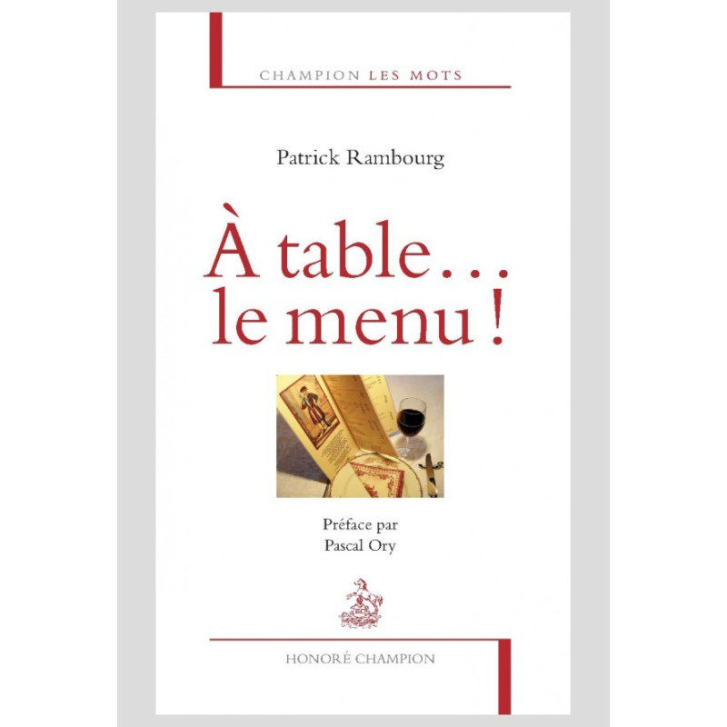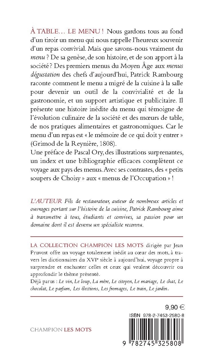 À TABLE… LE MENU ! Nous gardons tous au fond d’un tiroir un menu qui nous rappelle l’heureux souvenir d’un repas convivial. Mais que savons-nous vraiment du menu ? De sa genèse, de son histoire, et de son apport à la société? Des premiers menus du Moyen Âge aux menus dégustation des chefs d’aujourd’hui, Patrick Rambourg raconte comment le menu a migré de la cuisine à la salle pour devenir un outil de la convivialité et de la gastronomie, et un support artistique et publicitaire. Il présente une histoire inédite du menu qui témoigne de l’évolution culinaire de la société et des mœurs de table, de nos pratiques alimentaires et gastronomiques. Car le menu d’un repas est « le mémoire de ce qui doit y entrer » (Grimod de la Reynière, 1808). Une préface de Pascal Ory, des illustrations surprenantes, un index et une bibliographie efficaces complètent ce voyage aux pays des menus. Avec ses contrastes, des « petits soupers de Choisy » aux « menus de l’Occupation » !