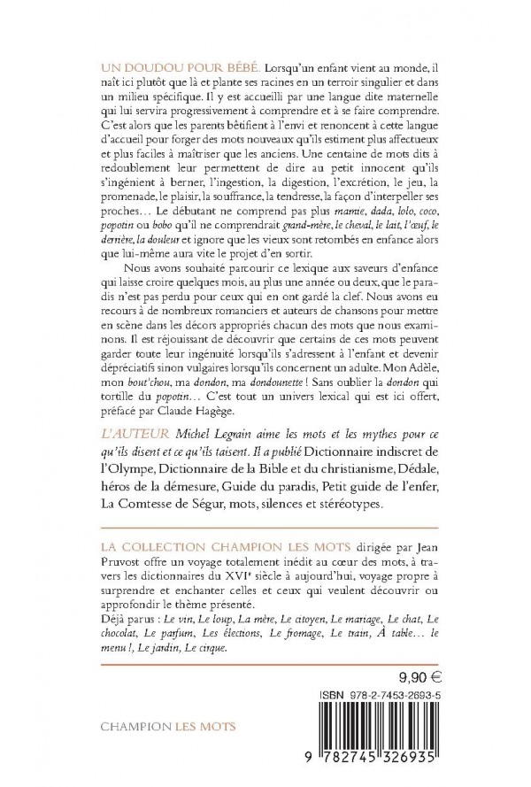 Lorsqu’un enfant vient au monde, il naît ici plutôt que là et plante ses racines en un terroir singulier et dans un milieu spécifique. Il y est accueilli par une langue dite maternelle qui lui servira progressivement à comprendre et à se faire comprendre. C’est alors que les parents bêtifient à l’envi et renoncent à cette langue d’accueil pour forger des mots nouveaux qu’ils estiment plus affectueux et plus faciles à maîtriser que les anciens. Une centaine de mots dits à redoublement leur permettent de dire au petit innocent qu’ils s’ingénient à berner, l’ingestion, la digestion, l’excrétion, le jeu, la promenade, le plaisir, la souffrance, la tendresse, la façon d’interpeller ses proches… Le débutant ne comprend pas plus « mamie », « dada », « lolo », « coco », « popotin » ou « bobo » qu’il ne comprendrait « grand-mère », « le cheval », « le lait », « l’œuf », « le derrière », « la douleur » et ignore que les vieux sont retombés en enfance alors que lui-même aura vite le projet d’en sortir. Nous avons souhaité parcourir ce lexique aux saveurs d’enfance qui laisse croire quelques mois, au plus une année ou deux, que le paradis n’est pas perdu pour ceux qui en ont gardé la clef. Nous avons eu recours à de nombreux romanciers et auteurs de chansons pour mettre en scène dans les décors appropriés chacun des mots que nous examinons. Il est réjouissant de découvrir que certains de ces mots peuvent garder toute leur ingénuité lorsqu’ils s’adressent à l’enfant et devenir dépréciatifs sinon vulgaires lorsqu’ils concernent un adulte. Mon Adèle, mon « bout’chou », ma « dondon », ma « dondounette » ! Sans oublier la « dondon » qui tortille du « popotin »… C’est tout un univers lexical qui est ici offert, préfacé par Claude Hagège.