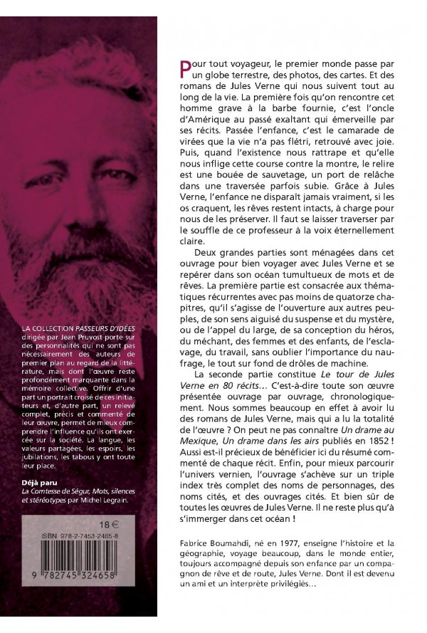 Pour tout voyageur, le premier monde passe par un globe terrestre, des photos, des cartes. Et des romans de Jules Verne qui nous suivent tout au long de la vie. La première fois qu’on rencontre cet homme grave à la barbe fournie, c’est l’oncle d’Amérique au passé exaltant qui émerveille par ses récits. Passée l’enfance, c’est le camarade de virées que la vie n’a pas flétri, retrouvé avec joie. Puis, quand l’existence nous rattrape et qu’elle nous inflige cette course contre la montre, le relire est une bouée de sauvetage, un port de relâche dans une traversée parfois subie. Grâce à Jules Verne, l’enfance ne disparaît jamais vraiment, si les os craquent, les rêves restent intacts, à charge pour nous de les préserver. Il faut se laisser traverser par le souffle de ce professeur à la voix éternellement claire. Deux grandes parties sont ménagées dans cet ouvrage pour bien voyager avec Jules Verne et se repérer dans son océan tumultueux de mots et de rêves. La première partie est consacrée aux thématiques récurrentes avec pas moins de quatorze chapitres, qu’il s’agisse de l’ouverture aux autres peuples, de son sens aiguisé du suspense et du mystère, ou de l’appel du large, de sa conception du héros, du méchant, des femmes et des enfants, de l’esclavage, du travail, sans oublier l’importance du naufrage, le tout sur fond de drôles de machine. La seconde partie constitue Le tour de Jules Verne en 80 récits… C’est-à-dire toute son oeuvre présentée ouvrage par ouvrage, chronologiquement. Nous sommes beaucoup en effet à avoir lu des romans de Jules Verne, mais qui a lu la totalité de l’œuvre ? On peut ne pas connaître Un drame au Mexique, Un drame dans les airs publiés en 1852 ! Aussi est-il précieux de bénéficier ici du résumé commenté de chaque récit. Enfin, pour mieux parcourir l’univers vernien, l’ouvrage s’achève sur un triple index très complet des noms de personnages, des noms cités, et des ouvrages cités. Et bien sûr de toutes les œuvres de Jules Verne. Il ne reste plus qu’à s’immerger dans cet océan !