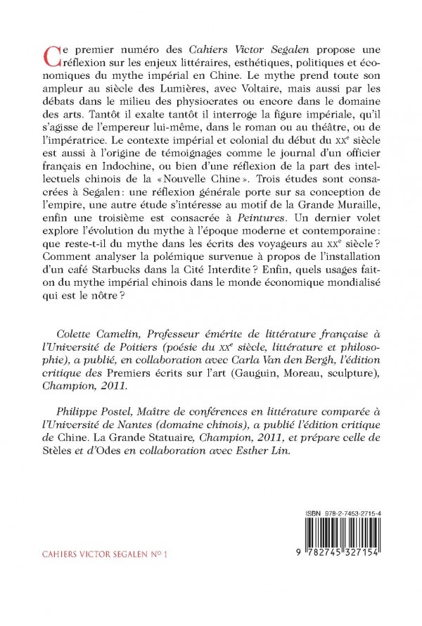 Ce premier numéro des « Cahiers Victor Segalen » propose une réflexion sur les enjeux littéraires, esthétiques, politiques et économiques du mythe impérial en Chine. Le mythe prend toute son ampleur au siècle des Lumières, avec Voltaire, mais aussi par les débats dans le milieu des physiocrates ou encore dans le domaine des arts. Tantôt il exalte tantôt il interroge la figure impériale, qu’il s’agisse l’empereur lui-même, dans le roman ou au théâtre, ou de l’impératrice. Le contexte impérial et colonial du début du XXe siècle est aussi à l’origine de témoignages comme le journal d’un officier français en Indochine, ou bien d’une réflexion de la part des intellectuels chinois de la «Nouvelle Chine ». Trois études sont consacrées à Segalen : une réflexion générale porte sur sa conception de l’empire, une autre étude s’intéresse au motif de la Grande Muraille, enfin une troisième est consacrée à « Peintures ». Un dernier volet explore l’évolution du mythe à l’époque moderne et contemporaine : que reste-t-il du mythe dans les écrits des voyageurs au XXe siècle ? Comment analyser la polémique survenue à propos de l’installation d’un café Starbucks dans la Cité Interdite ? Enfin, quels usages fait-on du mythe impérial chinois dans le monde économique mondialisé qui est le nôtre ?