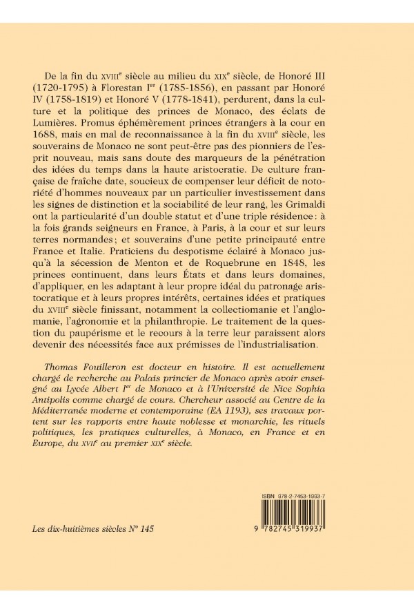De la fin du XVIIIe siècle au milieu du XIXe siècle, de Honoré III (1720-1795) à Florestan Ier (1785-1856), en passant par Honoré IV (1758-1819) et Honoré V (1778-1841), perdurent, dans la culture et la politique des princes de Monaco, des éclats de Lumières. Promus éphémèrement princes étrangers à la cour en 1688, mais en mal de reconnaissance à la fin du XVIIIe siècle, les souverains de Monaco ne sont peut-être pas des pionniers de l`esprit nouveau, mais sans doute des marqueurs de la pénétration des idées du temps dans la haute aristocratie. De culture française de fraîche date, soucieux de compenser leur déficit de notoriété d`hommes nouveaux par un particulier investissement dans les signes de distinction et la sociabilité de leur rang, les Grimaldi ont la particularité d`un double statut et d`une triple résidence : à la fois grands seigneurs en France, à Paris, à la cour et sur leurs terres normandes ; et souverains d`une petite principauté entre France et Italie. Praticiens du despotisme éclairé à Monaco jusqu`à la sécession de Menton et de Roquebrune en 1848, les princes continuent, dans leurs États et dans leurs domaines, d`appliquer, en les adaptant à leur propre idéal du patronage aristocratique et à leurs propres intérêts, certaines idées et pratiques du XVIIIe siècle finissant, notamment la collectiomanie et l`anglomanie, l`agronomie et la philanthropie. Le traitement de la question du paupérisme et le recours à la terre leur paraissent alors devenir des nécessités face aux prémisses de l`industrialisation. Thomas Fouilleron est docteur en histoire. Il est actuellement chargé de recherche au Palais princier de Monaco après avoir enseigné au Lycée Albert Ier de Monaco et à l`Université de Nice Sophia Antipolis comme chargé de cours. Chercheur associé au Centre de la Méditerranée moderne et contemporaine (EA 1193), ses travaux portent sur les rapports entre haute noblesse et monarchie, les rituels politiques, les pratiques culturelles, à Monaco, en France et en Europe, du XVIIe au premier XIXe siècle.