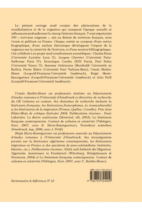 Le présent ouvrage rend compte des phénomènes de la mondialisation et de la migration qui marquent l`époque actuelle et influencent profondément le champ littéraire français. Y sont répertoriés 300 « écrivains migrants », nés en dehors du territoire français, mais vivant et publiant en France. Chaque entrée se compose d`une notice biographique, d`une analyse thématique développant l`impact de la migrance sur la créativité de l`écrivain, et d`une section bibliographique. Ont collaboré à ce projet neuf coordinateurs scientifiques : Charles Bonn (Université Lumière Lyon II), Jacques Chevrier (Université Paris- Sorbonne Paris IV), Dominique Combe (ENS Paris), Paul Dirkx (Université Nancy II), Susanne Gehrmann (Humboldt Universität zu Berlin), Pierre Halen (Université Paul Verlaine-Metz), Ursula Mathis- Moser (Leopold-Franzens-Universität Innsbruck), Birgit Mertz- Baumgartner (Leopold-Franzens-Universität Innsbruck) et Julia Pröll (Leopold-Franzens-Universität Innsbruck).