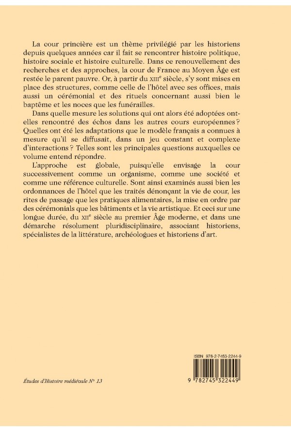 La cour princière est un thème privilégié par les historiens depuis quelques années car il fait se rencontrer histoire politique, histoire sociale et histoire culturelle. Dans ce renouvellement des recherches et des approches, la cour de France au Moyen Âge est restée le parent pauvre. Or, à partir du XIIIe siècle, s`y sont mises en place des structures, comme celle de l`hôtel avec ses offices, mais aussi un cérémonial et des rituels concernant aussi bien le baptême et les noces que les funérailles. Dans quelle mesure les solutions qui ont alors été adoptées ontelles rencontré des échos dans les autres cours européennes? Quelles ont été les adaptations que le modèle français a connues à mesure qu`il se diffusait, dans un jeu constant et complexe d`interactions ? Telles sont les principales questions auxquelles ce volume entend répondre. L`approche est globale, puisqu`elle envisage la cour successivement comme un organisme, comme une société et comme une référence culturelle. Sont ainsi examinés aussi bien les ordonnances de l`hôtel que les traités dénonçant la vie de cour, les rites de passage que les pratiques alimentaires, la mise en ordre par des cérémonials que les bâtiments et la vie artistique. Et ceci sur une longue durée, du XIIe siècle au premier Âge moderne, et dans une démarche résolument pluridisciplinaire, associant historiens, spécialistes de la littérature, archéologues et historiens d`art.