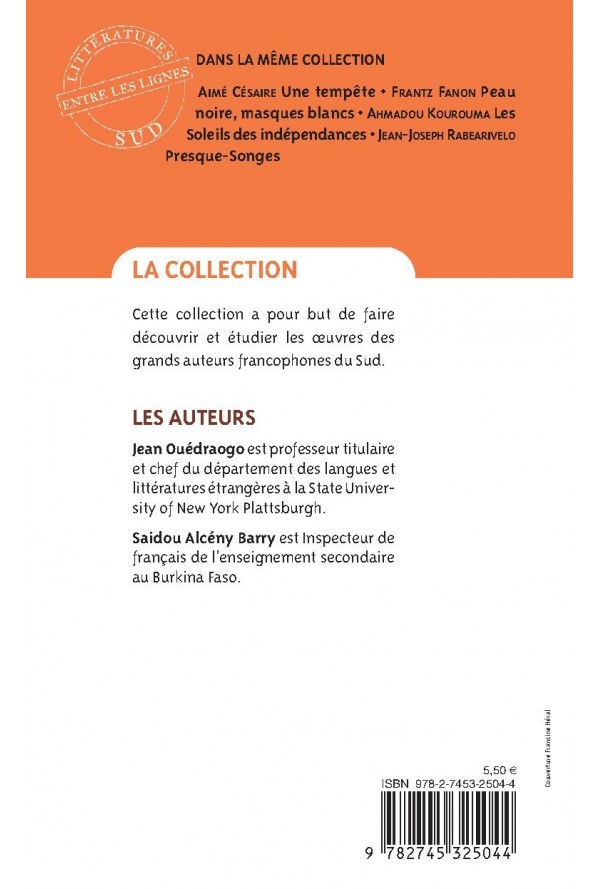 Jean Ouédraogo est professeur titulaire et chef du département des langues et littératures étrangères à la State University of New York Plattsburgh. Saidou Alcény Barry est Inspecteur de français de l’enseignement secondaire au Burkina Faso.