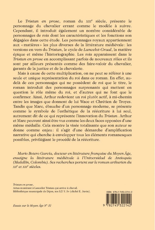 Le Tristan en prose, roman du XIIIe siècle, présente le personnage du chevalier errant comme le modèle à suivre. Cependant, il introduit également un nombre considérable de personnages de rois dont les caractéristiques et les fonctions son dégagées dans cette étude. Les personnages royaux appartiennent aux "matières " les plus diverses de la littérature médiévale : les versions en vers du Tristan, le cycle de Lancelot-Graal, la matière épique et même l`historiographie. Les rois apparaissent dans le Tristan en prose en accomplissant parfois de nouveaux rôles et ils sont par ailleurs présentés comme des faire-valoir du chevalier, garants de la justice et de la chevalerie. Mais à cause de cette multiplication, on ne peut se référer à une seule et unique représentation du roi dans ce roman. En effet, au-delà de ces personnages qui ne possèdent de roi que le titre, le roman introduit des personnages surprenants qui mettent en question le rôle même du roi, et d`autres qui ne font que le confirmer. Ainsi, Arthur redevient un roi plutôt actif, à mi-chemin entre les images que donnent de lui Wace et Chrétien de Troyes. Tandis que Marc, ébauche d`un personnage moderne, se présente comme le symbole de l`esthétique de la réécriture à lui seul, autrement dit de ce qui représente l`innovation du Tristan. Arthur et Marc peuvent ainsi être vus comme les deux faces opposées d`une même médaille. Cela montre la visée totalisante que son auteur se donne comme enjeu: il s`agit d`une démarche d`amplification narrative qui cherche à envelopper tous les éléments romanesques possibles, privilégiant le procédé de la réécriture. Mario Botero García, docteur en littérature française du Moyen Âge, enseigne la littérature médiévale à l`Universidad de Antioquia (Medellín, Colombie). Ses recherches portent sur le roman arthurien du XIIe et XIIIe siècles.
