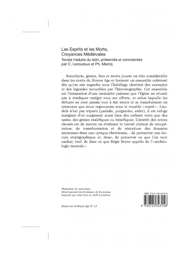 Sorcellerie, génies, fées et morts jouent un rôle considérable dans les écrits du Moyen Age et forment un ensemble cohérent dès qu`on sait regarder sous l`habillage chrétien des exemples et des légendes recueillies par l`historigraphie. Cet ensemble est l`émanation d`une mentalité paîenne que l`Église ne réussit pas à éradiquer malgré tous ses efforts, et selon laquelle les défunts ne sont jamais tout à fait morts et se transforment en créatures que nous regroupons sous le vocable " esprit ". L`au-delà n`est pas triparti (paradis, purgatoire, enfer), il est refuge marginal d`où surgissent aussi bien des enfants verts que des nains, des génies maléfiques ou bénéfiques. L`intérêt des textes choisis est de mettre en évidence le travail clérical de récupération, de transformation et de réécriture des données anciennes dans une optique chrétienne, - de permettre une lecture stratigraphique et, donc, de percevoir ce que l`on veut cacher, bref, de faire ce que Régis Boyer appelle de l` " archéologie mentale ".