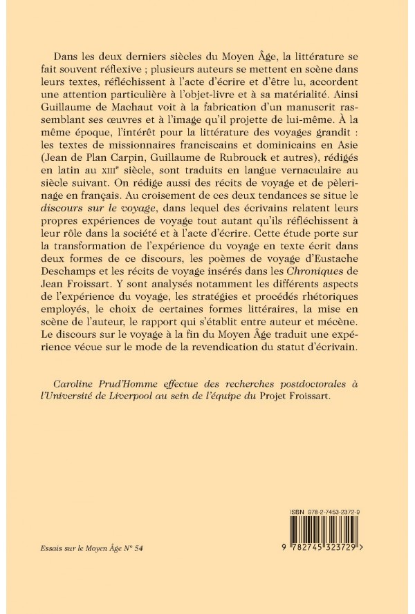 Dans les deux derniers siècles du Moyen Âge, la littérature se fait souvent réflexive ; plusieurs auteurs se mettent en scène dans leurs textes, réfléchissent à l’acte d’écrire et d’être lu, accordent une attention particulière à l’objet-livre et à sa matérialité. Ainsi Guillaume de Machaut voit à la fabrication d’un manuscrit rassemblant ses œuvres et à l’image qu’il projette de lui-même. À la même époque, l’intérêt pour la littérature des voyages grandit : les textes de missionnaires franciscains et dominicains en Asie (Jean de Plan Carpin, Guillaume de Rubrouck et autres), rédigés en latin au XIIIe siècle, sont traduits en langue vernaculaire au siècle suivant. On rédige aussi des récits de voyage et de pèlerinage en français. Au croisement de ces deux tendances se situe le discours sur le voyage, dans lequel des écrivains relatent leurs propres expériences de voyage tout autant qu’ils réfléchissent à leur rôle dans la société et à l’acte d’écrire. Cette étude porte sur la transformation de l’expérience du voyage en texte écrit dans deux formes de ce discours, les poèmes de voyage d’Eustache Deschamps et les récits de voyage insérés dans les Chroniques de Jean Froissart. Y sont analysés notamment les différents aspects de l’expérience du voyage, les stratégies et procédés rhétoriques employés, le choix de certaines formes littéraires, la mise en scène de l’auteur, le rapport qui s’établit entre auteur et mécène. Le discours sur le voyage à la fin du Moyen Âge traduit une expérience vécue sur le mode de la revendication du statut d’écrivain. Caroline Prud’Homme effectue des recherches postdoctorales à l’Université de Liverpool au sein de l’équipe du Projet Froissart.
