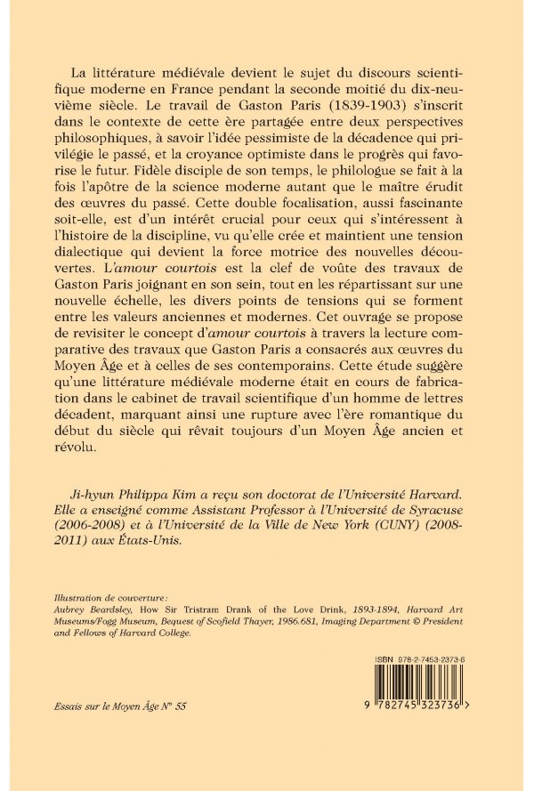 La littérature médiévale devient le sujet du discours scientifique moderne en France pendant la seconde moitié du dix-neuvième siècle. Le travail de Gaston Paris (1839-1903) s’inscrit dans le contexte de cette ère partagée entre deux perspectives philosophiques, à savoir l’idée pessimiste de la décadence qui privilégie le passé, et la croyance optimiste dans le progrès qui favorise le futur. Fidèle disciple de son temps, le philologue se fait à la fois l’apôtre de la science moderne autant que le maître érudit des œuvres du passé. Cette double focalisation, aussi fascinante soit-elle, est d’un intérêt crucial pour ceux qui s’intéressent à l’histoire de la discipline, vu qu’elle crée et maintient une tension dialectique qui devient la force motrice des nouvelles découvertes. L’amour courtois est la clef de voûte des travaux de Gaston Paris joignant en son sein, tout en les répartissant sur une nouvelle échelle, les divers points de tensions qui se forment entre les valeurs anciennes et modernes. Cet ouvrage se propose de revisiter le concept d’amour courtois à travers la lecture comparative des travaux que Gaston Paris a consacrés aux œuvres du Moyen Âge et à celles de ses contemporains. Cette étude suggère qu’une littérature médiévale moderne était en cours de fabrication dans le cabinet de travail scientifique d’un homme de lettres décadent, marquant ainsi une rupture avec l’ère romantique du début du siècle qui rêvait toujours d’un Moyen Âge ancien et révolu.