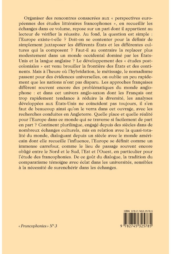 Organiser des rencontres consacrées aux « perspectives européennes des études littéraires francophones », en recueillir les échanges dans ce volume, repose sur un pari dont il appartient au lecteur de vérifier la réussite. Au fond, la question est simple : l’Europe existe-t-elle ? Doit-on se contenter pour la définir de simplement juxtaposer les différents États et les différentes cultures qui la composent ? Faut-il au contraire la replacer plus modestement dans un monde occidental dominé par les États-Unis et la langue anglaise ? Le développement des « études postcoloniales » est venu brouiller la frontière des États et des continents. Mais à l’heure où l’hybridation, le métissage, le nomadisme passent pour des évidences universelles, on oublie un peu rapidement que les nations n’ont pas disparu. Les approches françaises diffèrent souvent encore des problématiques du monde anglophone : et dans cet univers anglo-saxon dont les Français ont trop rapidement tendance à réduire la diversité, les analyses développées aux États-Unis ne coïncident pas toujours, il s’en faut de beaucoup ainsi qu’on le verra dans cet ouvrage, avec les recherches conduites en Angleterre. Quelle place et quelle réalité pour l’Europe dans ce monde qui se traverse si facilement de part en part ? Continent plurilingue, engagé depuis des siècles dans de nombreux échanges culturels, mis en relation avec la quasi-totalité du monde, dialoguant depuis un siècle avec le monde américain dont elle recueille l’influence, l’Europe se définit comme un immense carrefour, comme le lieu de passage souvent encore obligé entre le Nord et le Sud, l’Est et l’Ouest, en particulier pour l’étude des francophonies. De ce goût du dialogue, la tradition du comparatisme témoigne avec éclat dans les universités, sensibles à la nécessité de surenchérir dans les échanges.