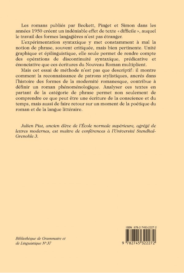 Les romans publiés par Beckett, Pinget et Simon dans les années 1950 créent un indéniable effet de texte "difficile ", auquel le travail des formes langagières n`est pas étranger. L`expérimentation syntaxique y met constamment à mal la notion de phrase, souvent critiquée, mais bien pertinente. Unité graphique et épilinguistique, elle seule permet de rendre compte des opérations de discontinuité syntaxique, prédicative et énonciative que ces écritures du Nouveau Roman multiplient. Mais cet essai de méthode n`est pas que descriptif : il montre comment la reconnaissance de patrons stylistiques, ancrés dans l`histoire des formes de la modernité romanesque, contribue à définir un roman phénoménologique. Analyser ces textes en partant de la catégorie de phrase permet non seulement de comprendre ce que peut être une écriture de la conscience et du temps, mais aussi de faire retour sur un moment de la poétique du roman et de la langue littéraire. Julien Piat, ancien élève de l`École normale supérieure, agrégé de lettres modernes, est maître de conférences à l`Université Stendhal- Grenoble 3.