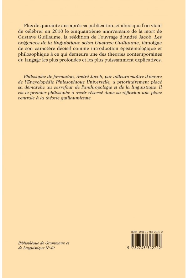 Plus de quarante ans après sa publication, et alors que l`on vient de célébrer en 2010 le cinquantième anniversaire de la mort de Gustave Guillaume, la réédition de l`ouvrage d`André Jacob, Les exigences de la linguistique selon Gustave Guillaume, témoigne de son caractère décisif comme introduction épistémologique et philosophique à ce qui demeure une des théories contemporaines du langage les plus profondes et les plus puissamment explicatives. Philosophe de formation, André Jacob, par ailleurs maître d`œuvre de l`Encyclopédie Philosophique Universelle, a prioritairement placé sa démarche au carrefour de l`anthropologie et de la linguistique. Il est le premier philosophe à avoir réservé dans sa réflexion une place centrale à la théorie guillaumienne.