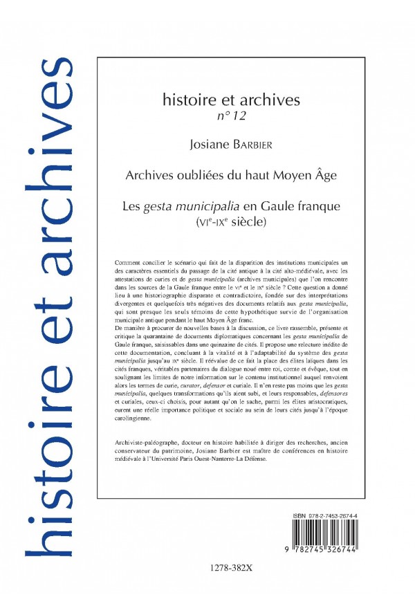qui sont presque les seuls témoins de cette hypothétique survie de l’organisation municipale antique pendant le haut Moyen Âge franc. De manière à procurer de nouvelles bases à la discussion, ce livre rassemble, présente et critique la quarantaine de documents diplomatiques concernant les gesta municipalia de Gaule franque, saisissables dans une quinzaine de cités. Il propose une relecture inédite de cette documentation, concluant à la vitalité et à l’adaptabilité du système des gesta municipalia jusqu’au IXe siècle. Il réévalue de ce fait la place des élites laïques dans les cités franques, véritables partenaires du dialogue noué entre roi, comte et évêque, tout en soulignant les limites de notre information sur le contenu institutionnel auquel renvoient