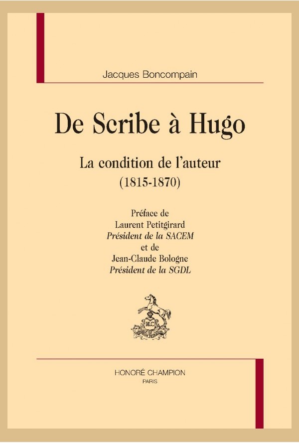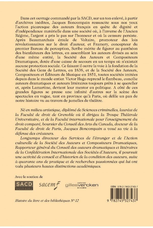 Dans cet ouvrage commandé par la SACD, sur un ton enlevé, à partir d’archives inédites, Jacques Boncompain ressuscite sous nos yeux l’action picaresque des auteurs français en quête de dignité et d’indépendance matérielle dans une société où, à l’inverse de l’Ancien Régime, l’argent a pris le pas sur l’honneur et où la censure persiste. Après Beaumarchais émule de Voltaire, promoteur des lois révolutionnaires sur le droit d’auteur, et Framery, concepteur du premier Bureau de perception, Scribe mérite de figurer au Panthéon des bienfaiteurs des lettres, en assemblant les auteurs divisés au sein d’une même entité, la Société des Auteurs et Compositeurs Dramatiques, dotée d’une caisse de secours en un temps où n’existait aucune protection sociale. Ce faisant il ouvre la voie à la fondation de la Société des Gens de Lettres, en 1838, et de la Société des Auteurs, Compositeurs et Éditeurs de Musique en 1851, toutes sociétés imitées depuis dans le monde entier. Victor Hugo reprend le flambeau, concilie auteurs dramatiques et auteurs littéraires toujours prêts à se quereller et, après Lamartine, devient leur mentor en politique. A côté de ces grandes figures se presse une infinité d’autres sur la scène des spectacles en vogue, tant en province qu’à Paris, où défile un pan de notre histoire vu au travers de jumelles de théâtre.